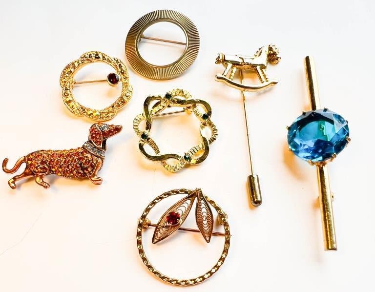 LOT OF BROOCHES, ROCKING HORSE, DOG, CIRCLES, STONES +