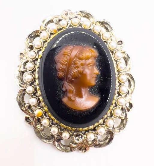 LARGE CAMEO PENDANT BROOCH BLACK BACKGROUND WITH STONES