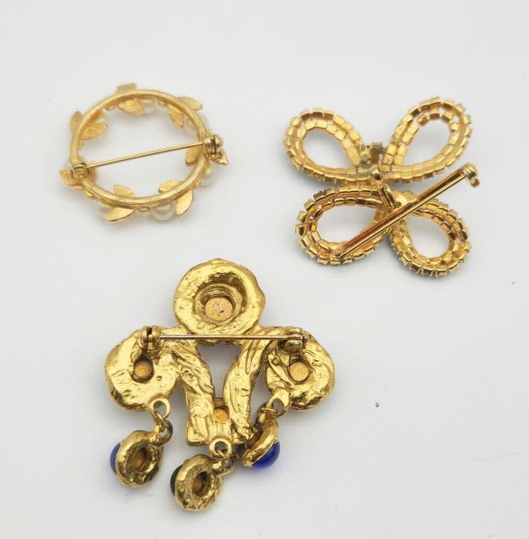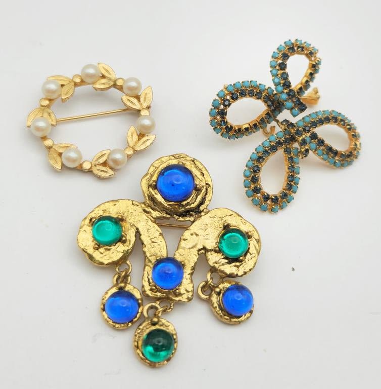 3 BROOCHES , W STONES AND FAUZ PEARLS