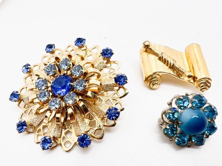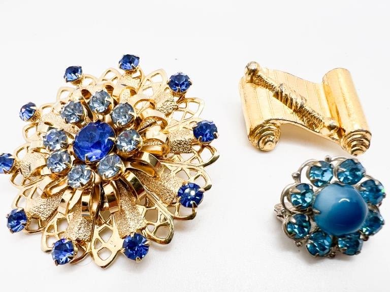 BEAUTIFUL BLUE STONES BROOCHES, AND SCROLL BROOCH