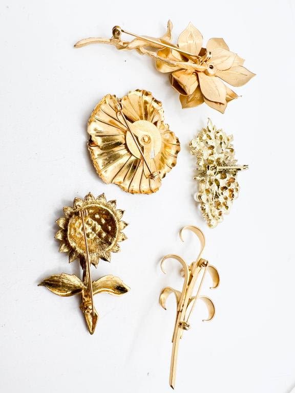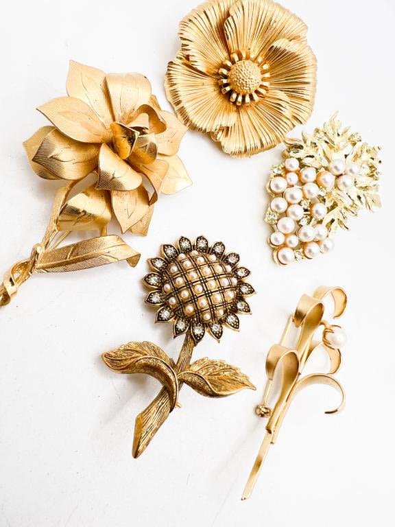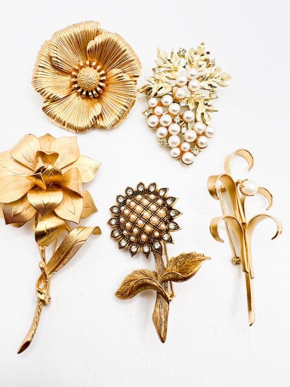 5 BROOCH ASSORTMENT, FLORALS, FAUX PEARLS, STONES