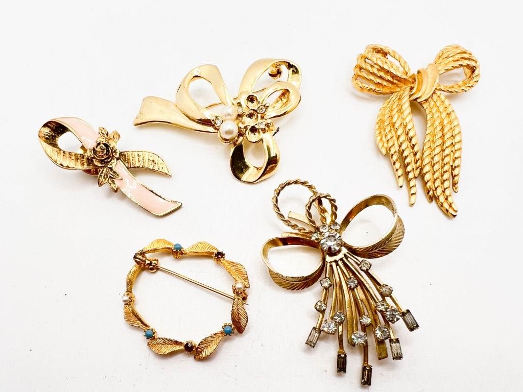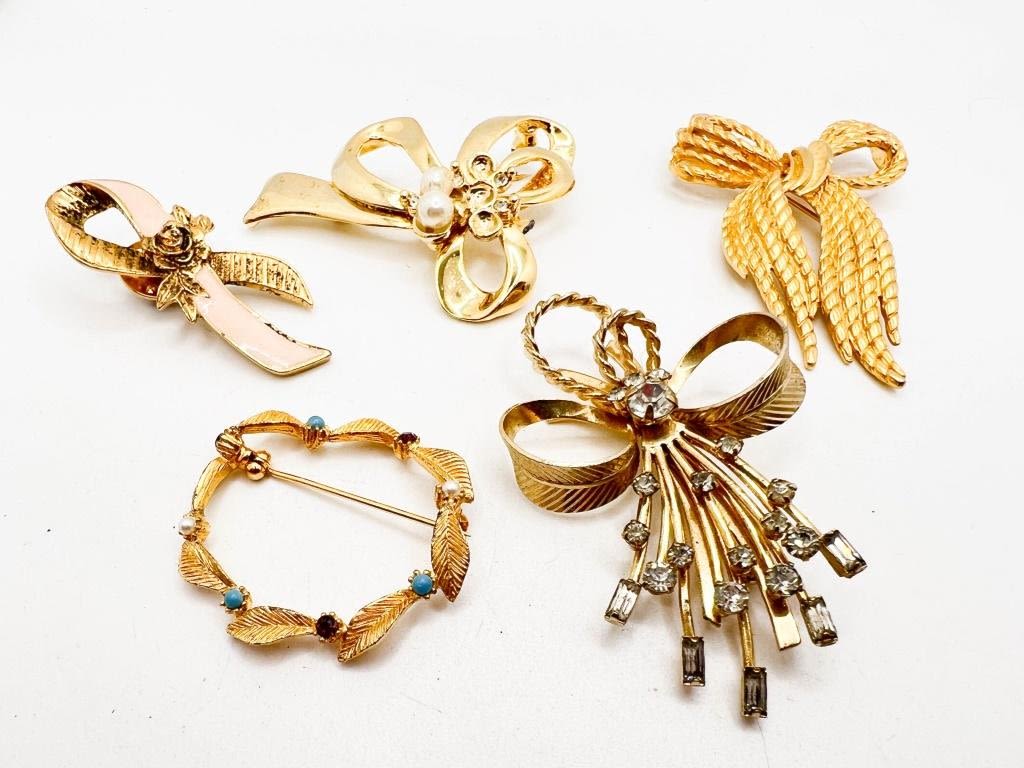 BOWS ASSORTMENT BROOCHES , CIRCLE BROOCH W STONES, ASSORTED, GOLD TONES