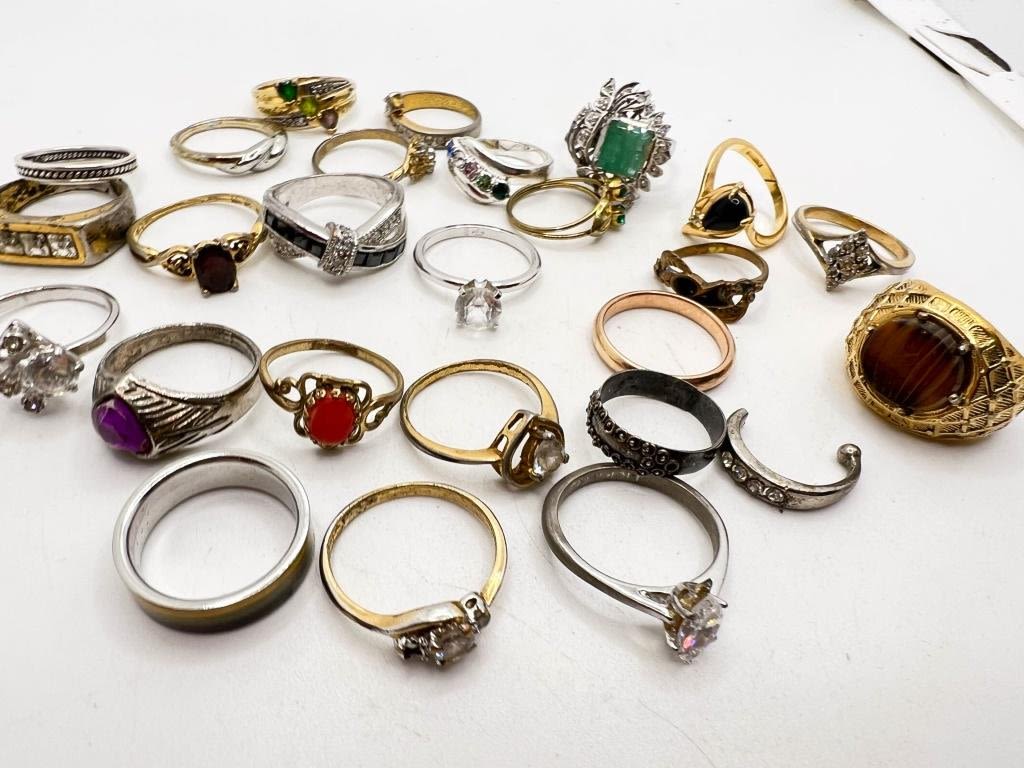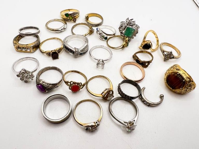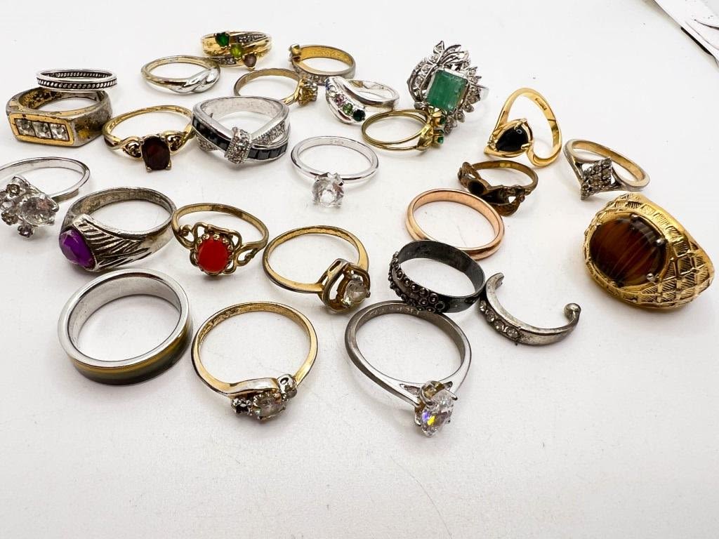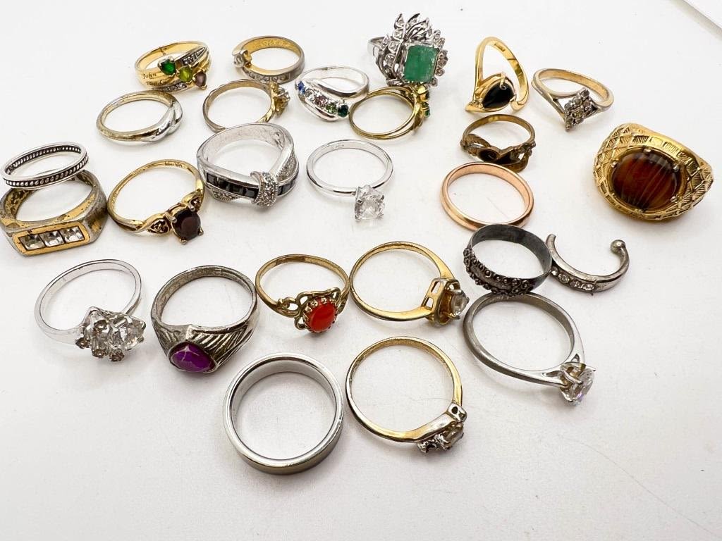 25 ASSORTED RINGS, ASSORTED STYLES, SIZES AND CONDITION