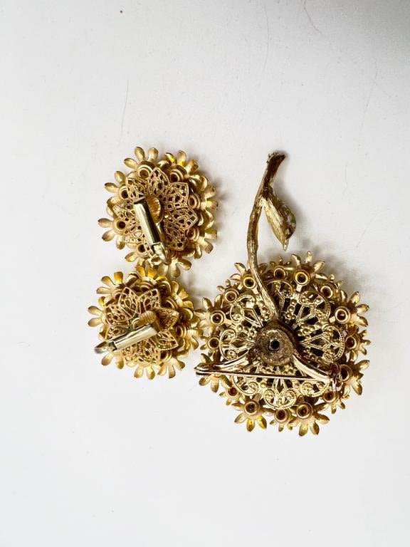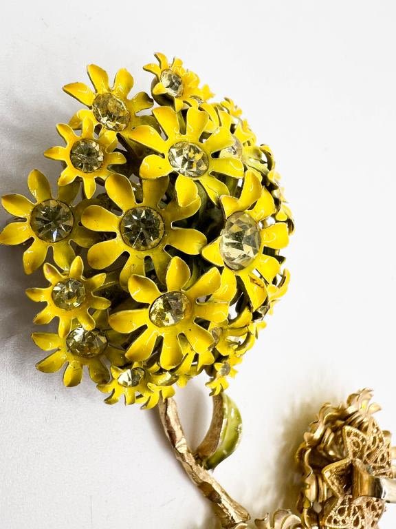 BEAUTIFUL VINTAGE FLORAL SET , YELLOW ENAMEIL WITH INSET STONES , BROOCH AND MATCHING EARRINGS SET