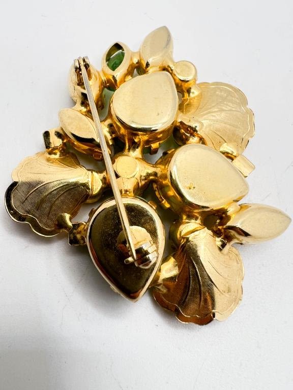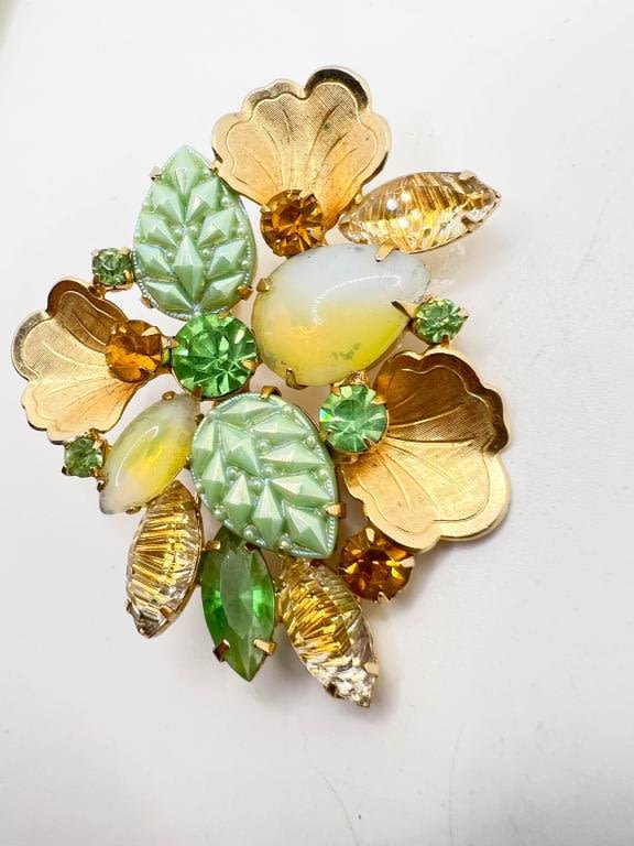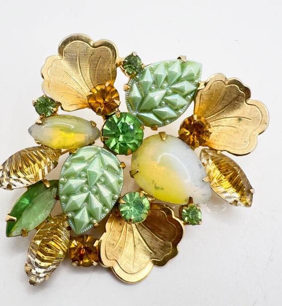 BEAUTIFUL FLORAL BROOCH , GREEN LEAVES, YELLOW STONES