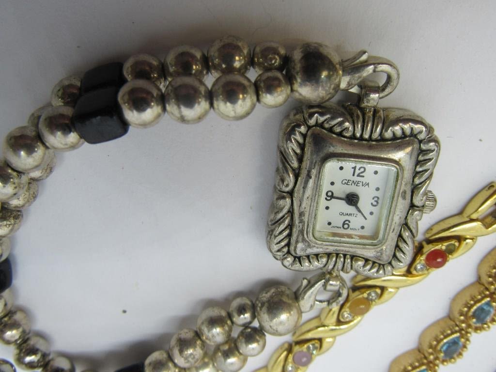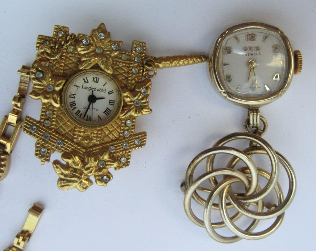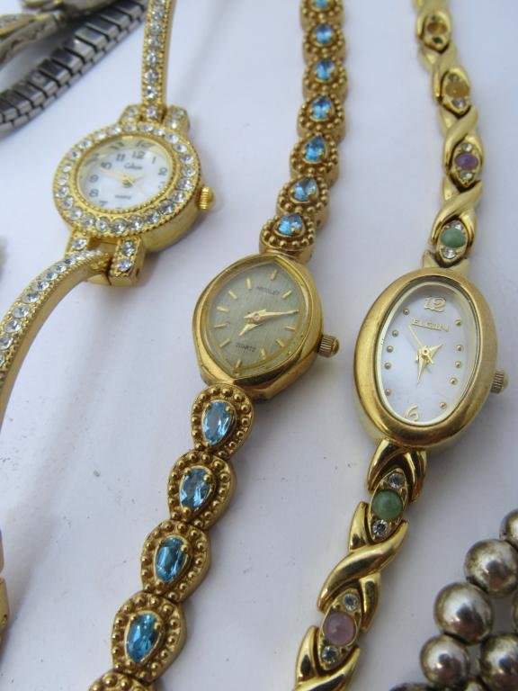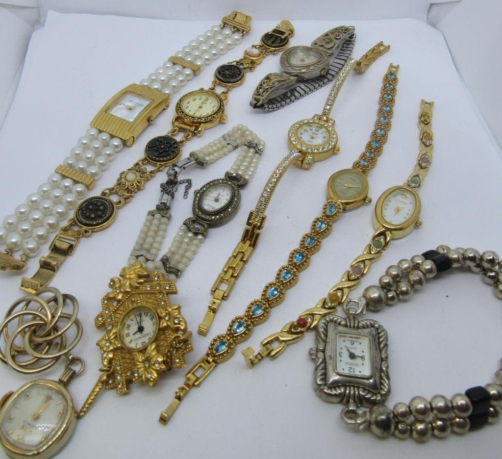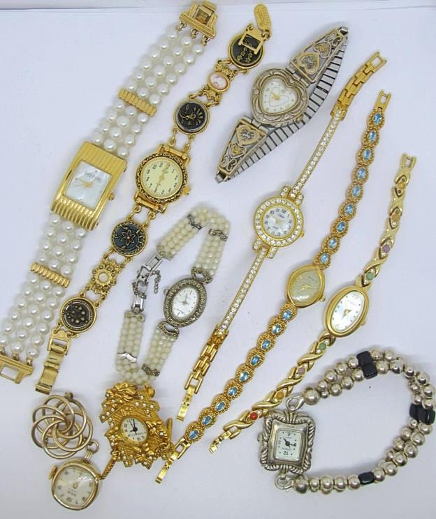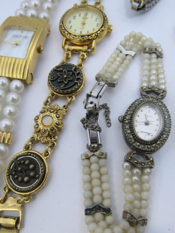 8 bracelet watches and two pin watches, each in different styles with pearls, rhinestones, delicate patterns, or colorful stones. Includes brands like Joan Rivers, Elgin, and many more! Mostly quartz, all untested as to