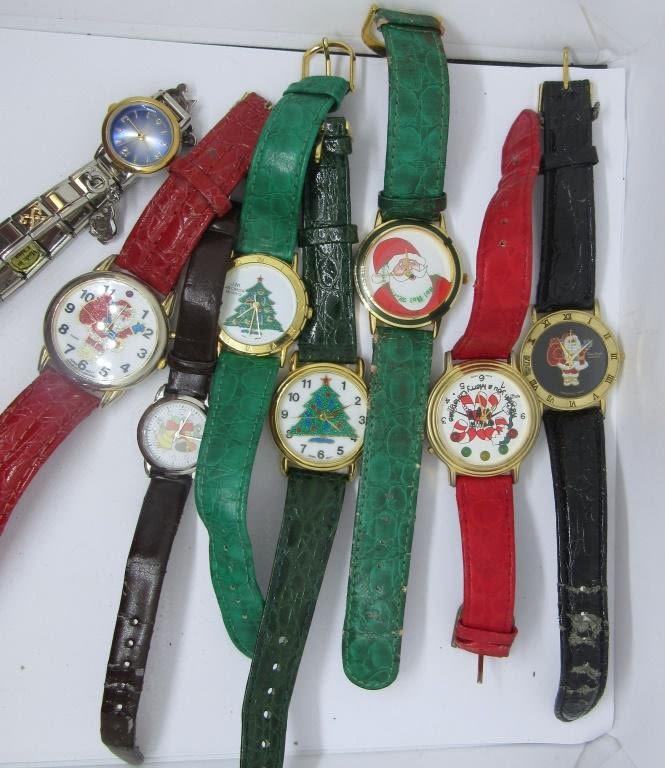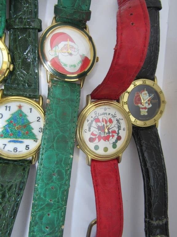 Fun novelty holiday watches! Includes mostly leather bands with one stainless steel bracelet watch with Christmas charms. Quartz watches, untested as to working.