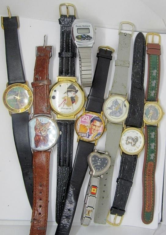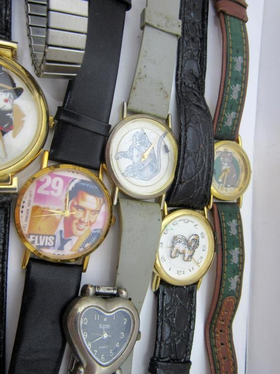Exciting mix of aniaml, race car, Elvis, and charm bracelet novelty watches. All are untested.