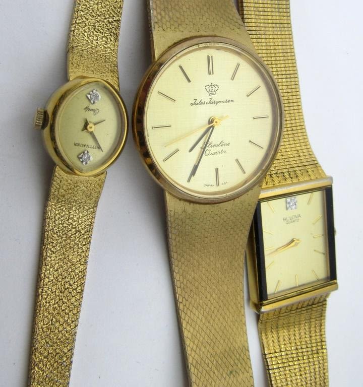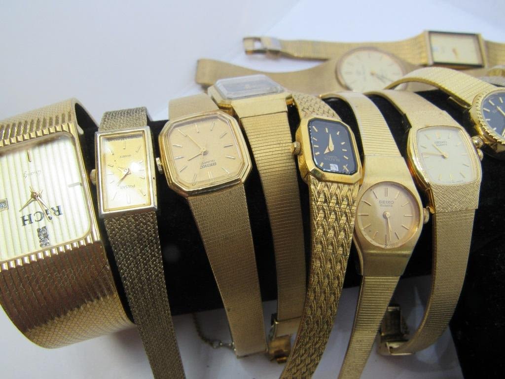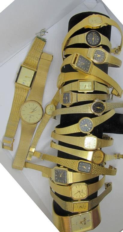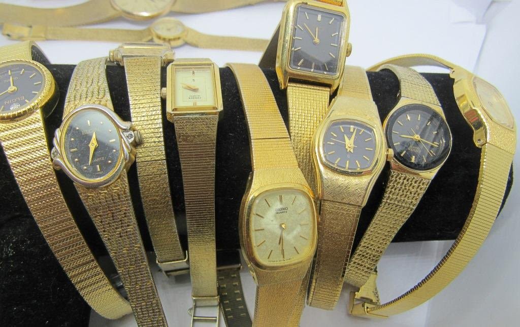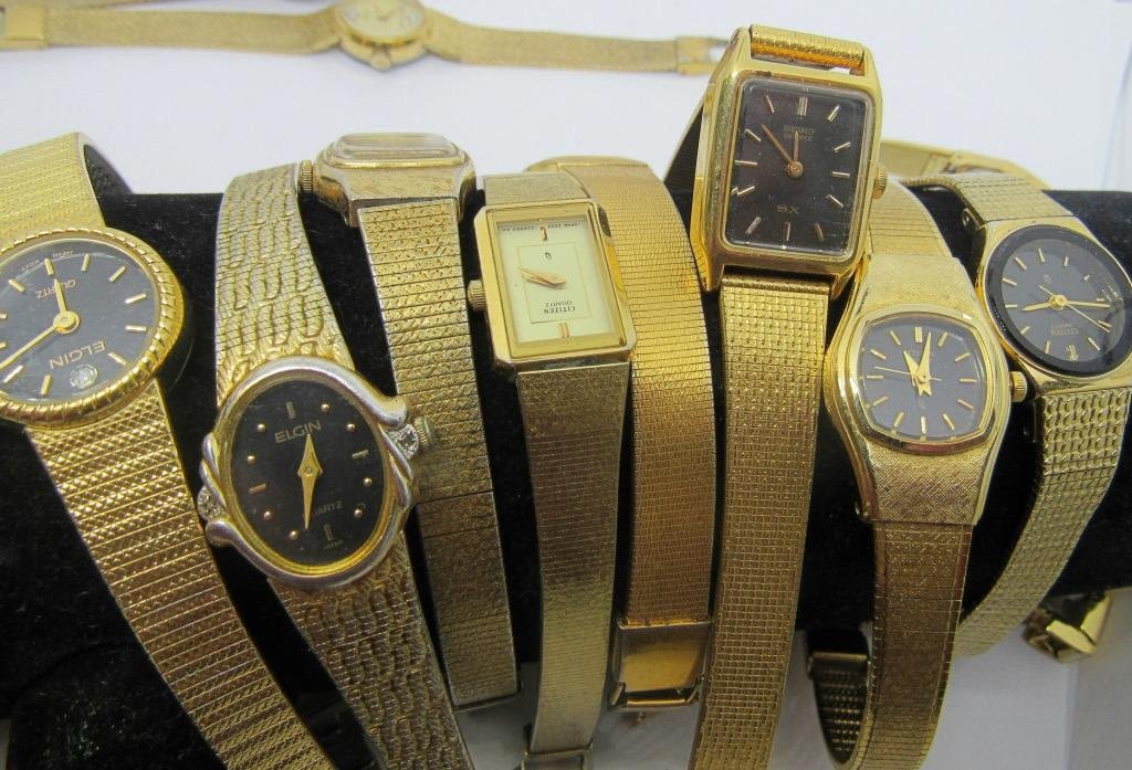 All gold toned bands and cases. Multiple band styles and brands including Elgin, Bulova, Seiko, Citizens, and more! Most are quartz watches, and all are untested. Good bulk lot!