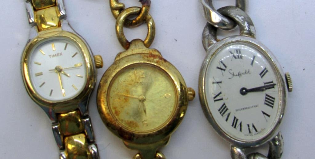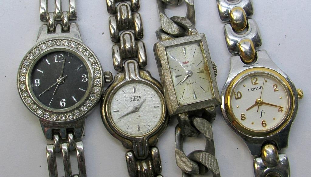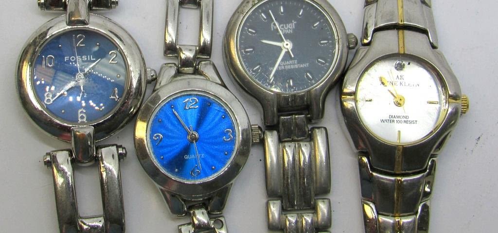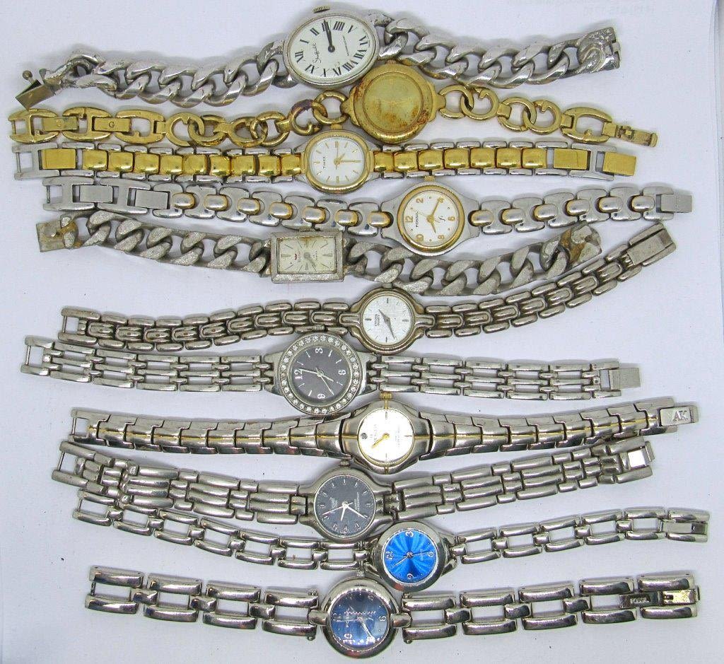 Variety of chain link band watches in different styles and colors. Untested but look to be in nice condition. Brands like Waltham, Timex, Fossil, Guess, and more! Some cleaning may be required