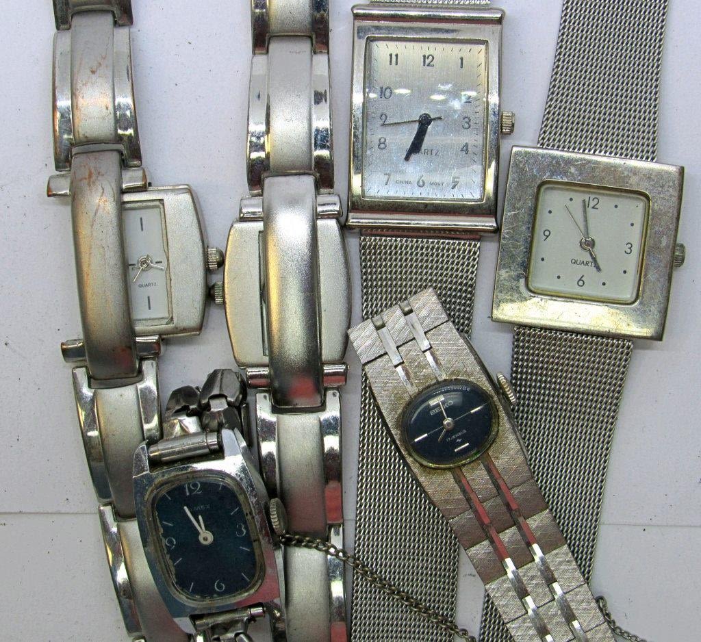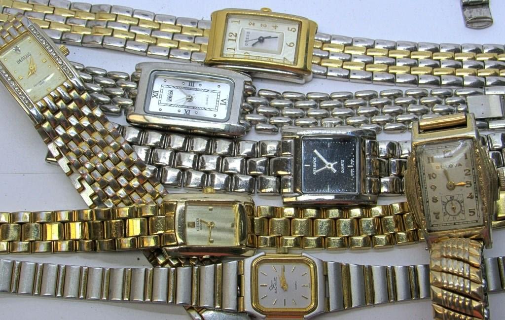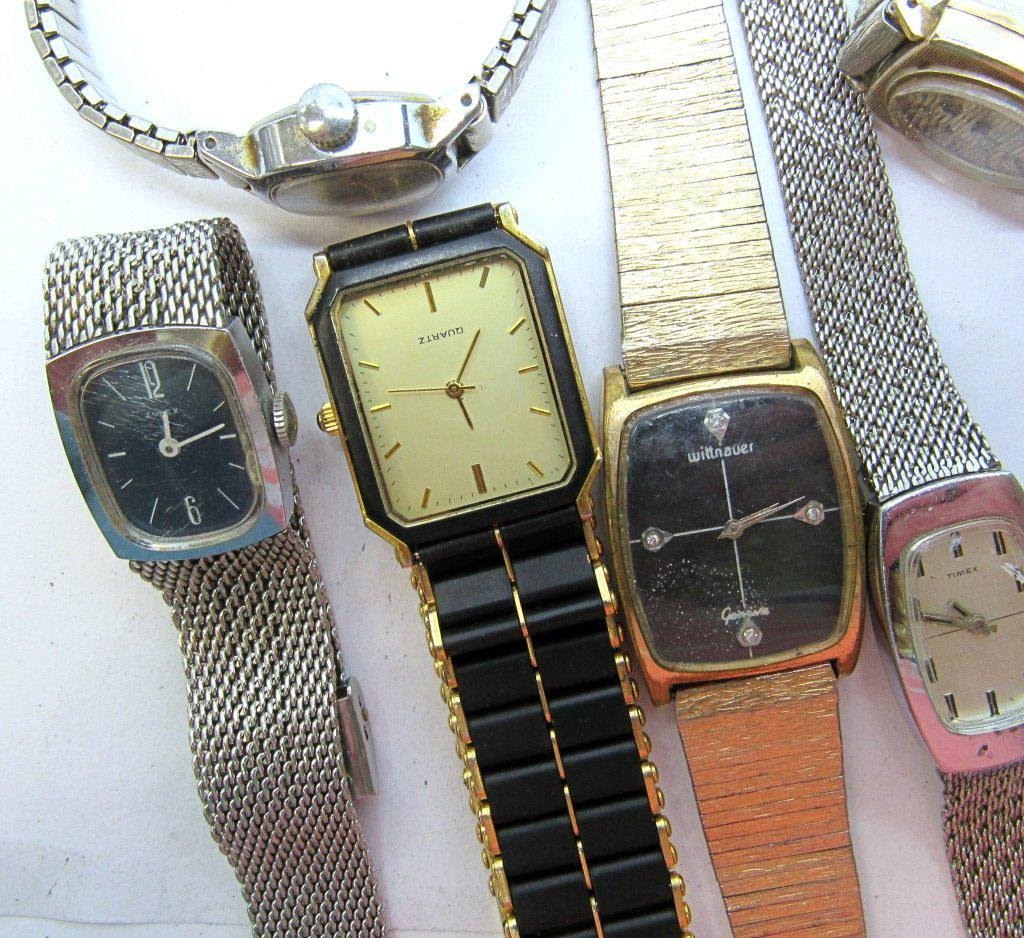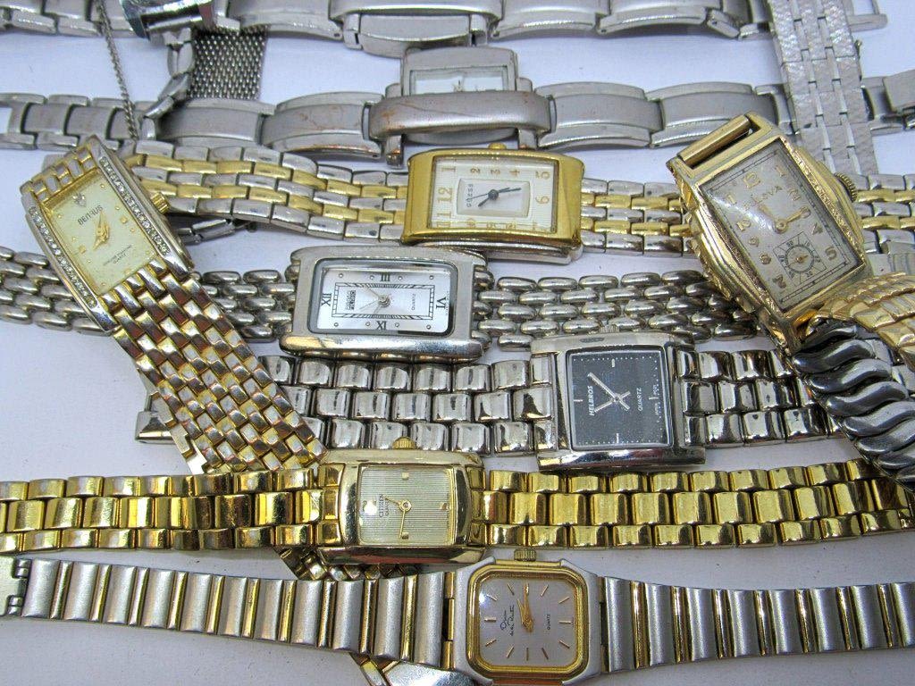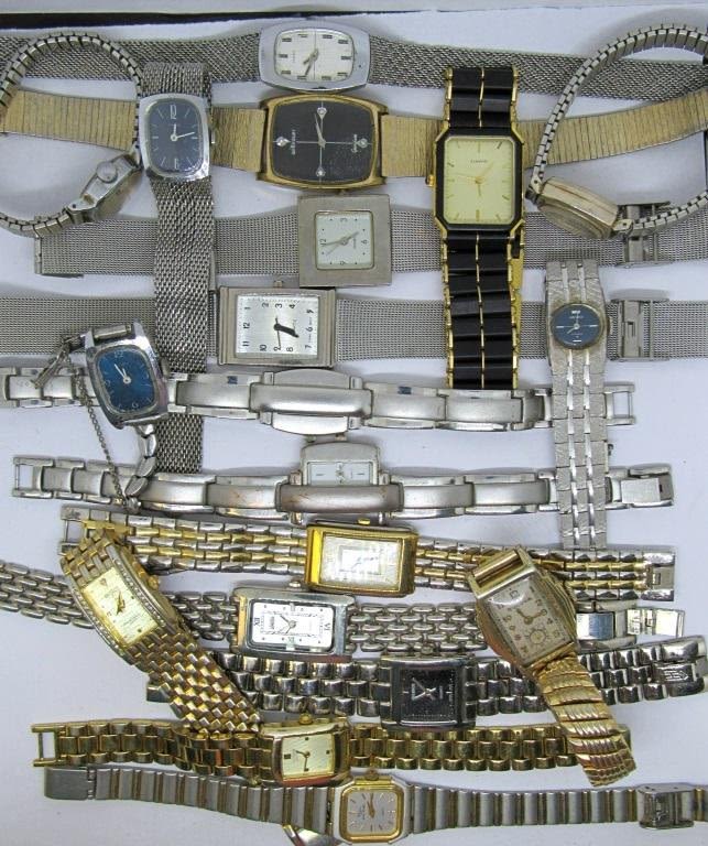 Mix of modern and vintage watches all with rectangle or square watch faces. Both silver and gold metal tones. All untested as to working, can be used for parts/repairs. Apperance in nice condition.