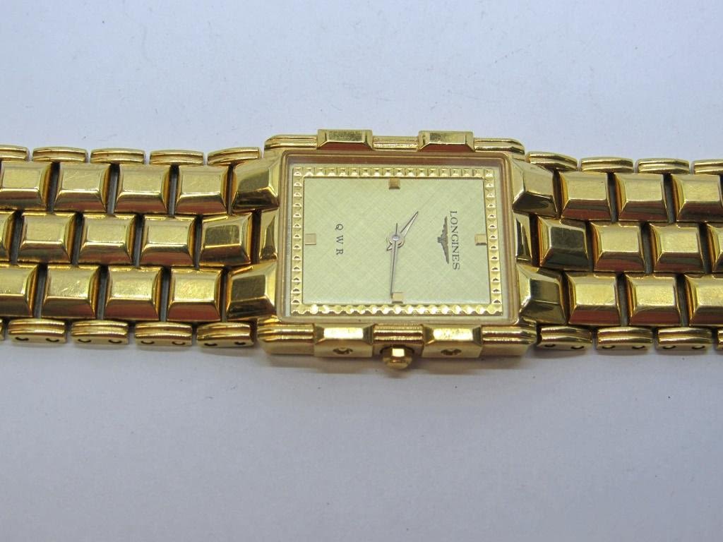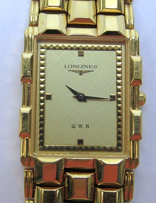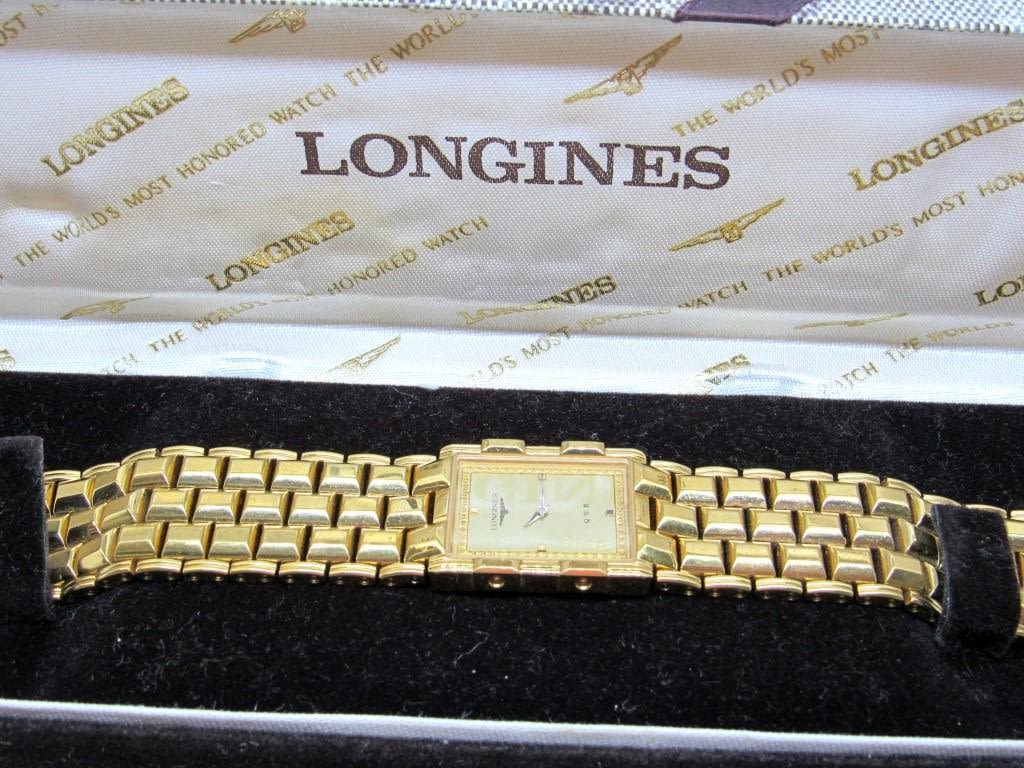 Classic gold toned quartz water resistant 7.5 inch long watch, stainless steel back. Untested, may need battery replacement. Crystal and face in great condition. Comes in original Longines box.