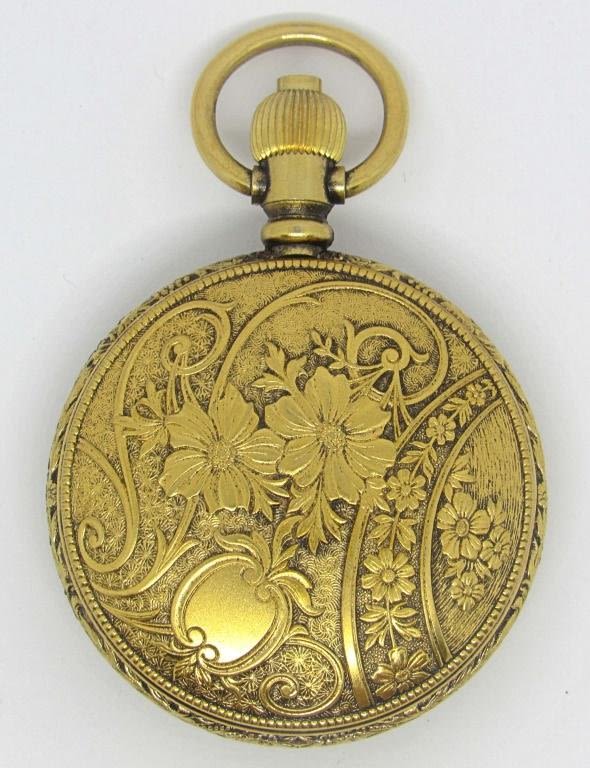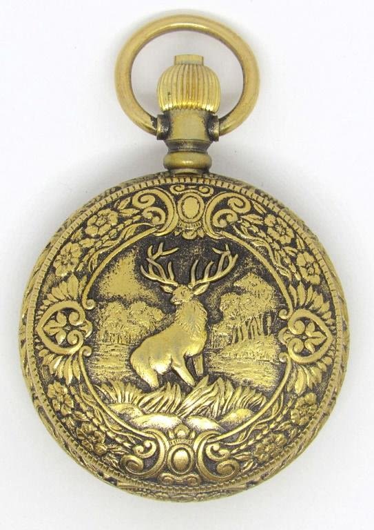 Beautiful gold toned watch with a deer and floral themed hunting case. Both face and case are in good condition, and the watch runs. Back is unable to be opened.
