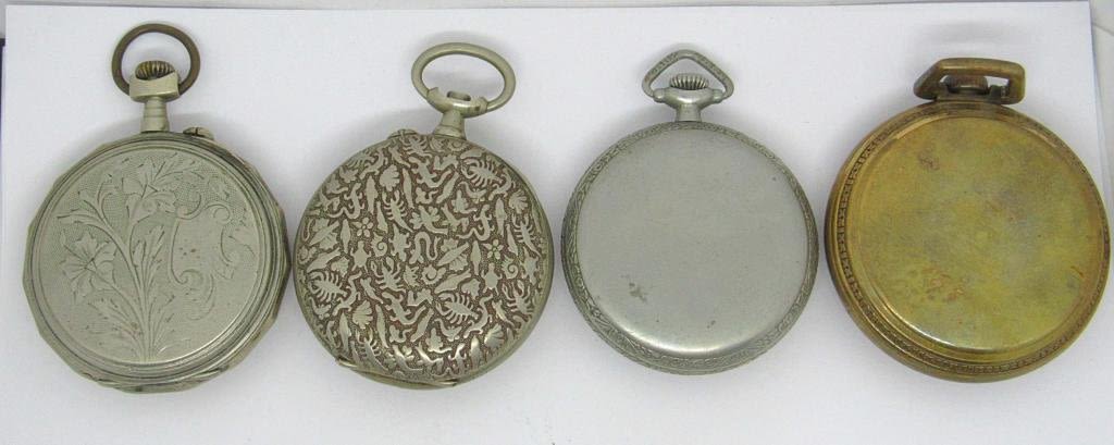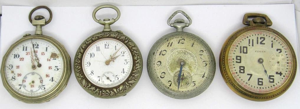 4 watches for parts and repairs. 2 Elgin, and two umarked watches. Elgin cases are very difficult to open. Nice cases, and unknown what repairs are needed.