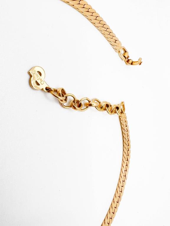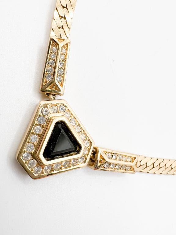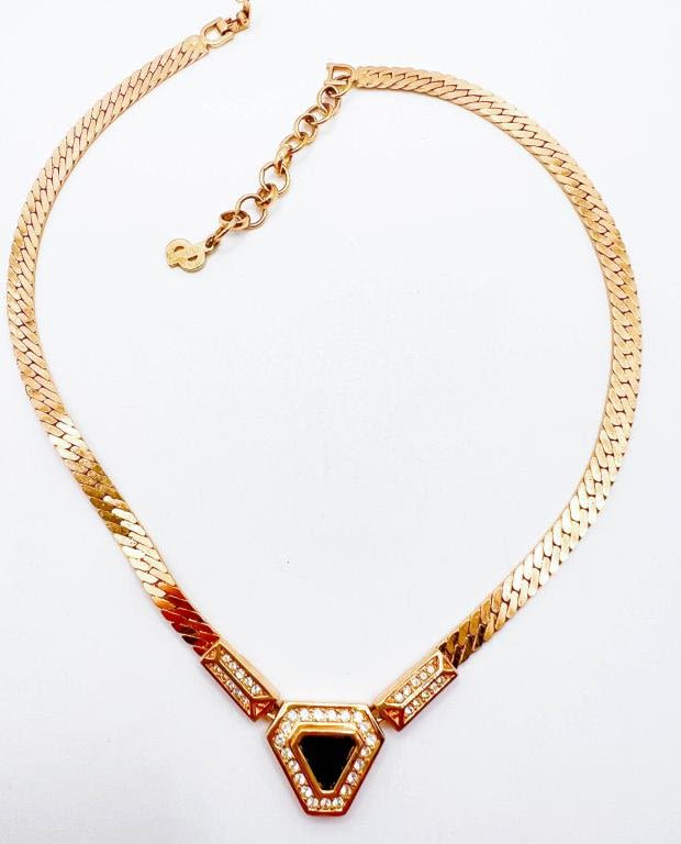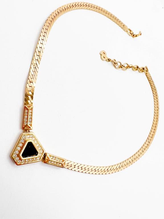 CHRISTIAN DIOR NECKLACE , SNAKE WEAVED CHAIN WITH BLACK ONYX COLOR STONE WITH MULTIPLE RHINESTONES SETTING, STUNNING !