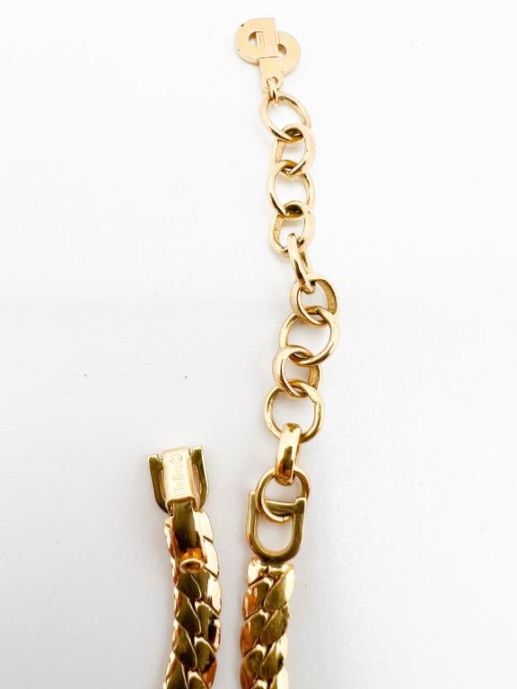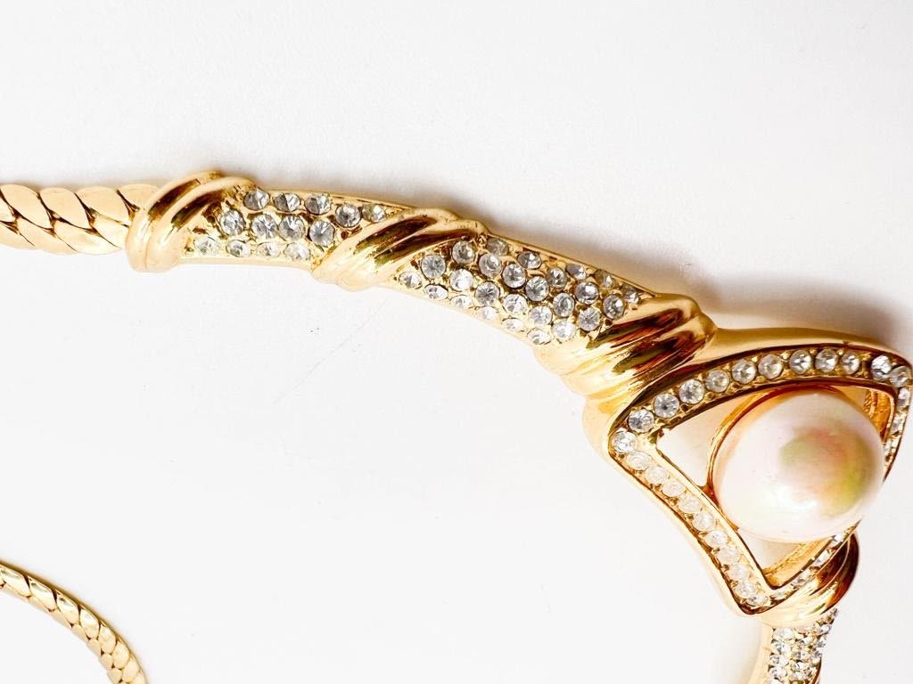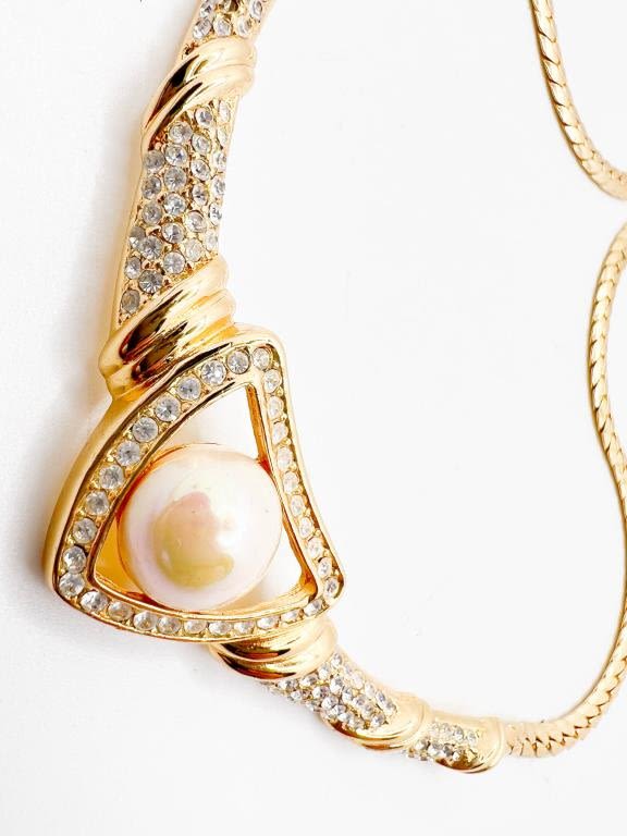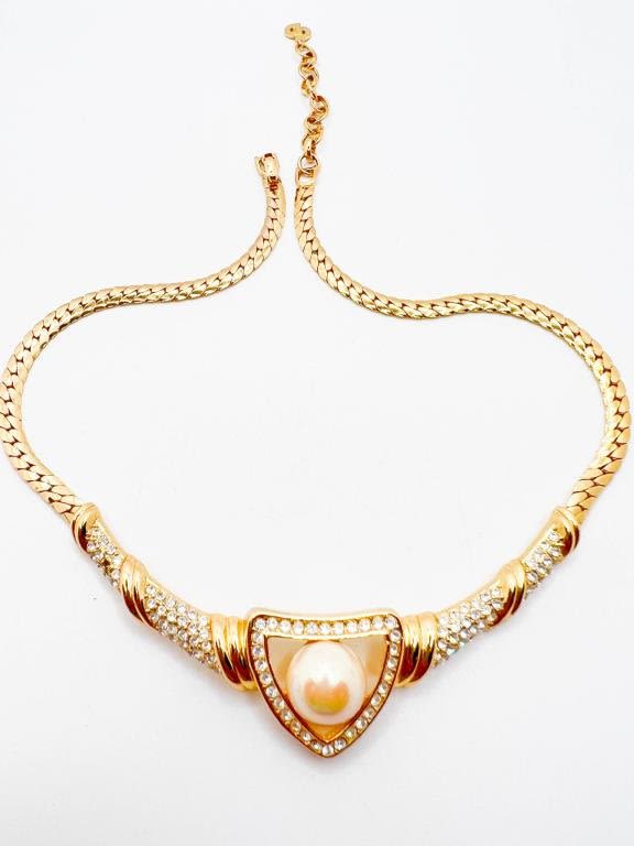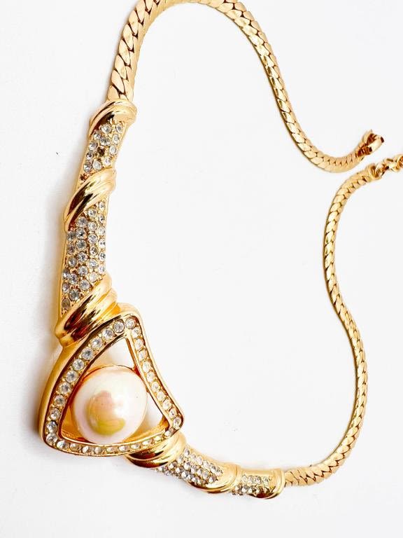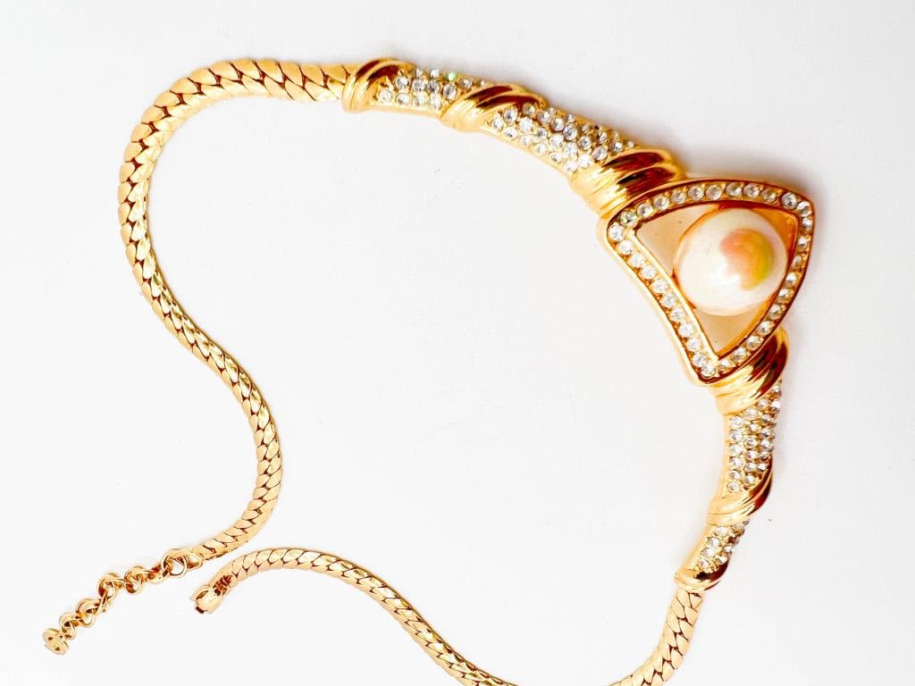 CHRISTIAN DIOR NECKLACE W LARGE FAUX PEARL WITH BRAINED CLEAR RHINESTONES SETTINGS , DIOR CLASP, SIGNED DIOR, AMAZING VINTAGE DIOR