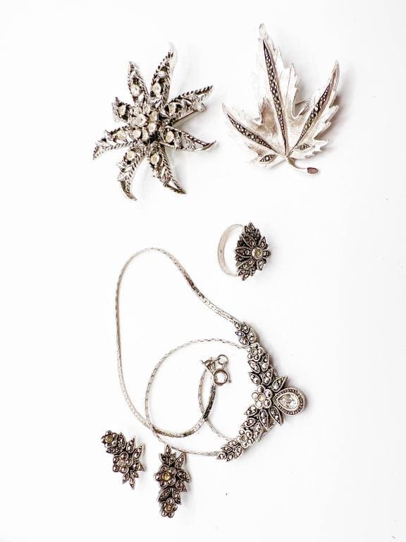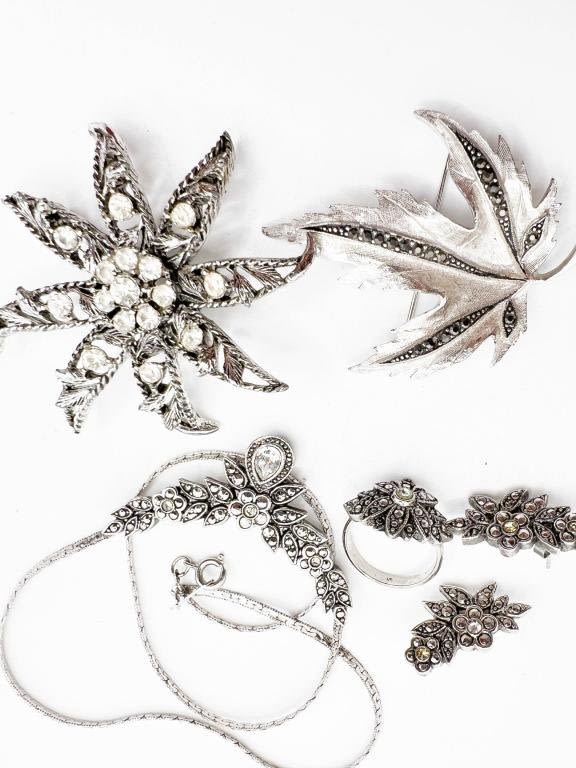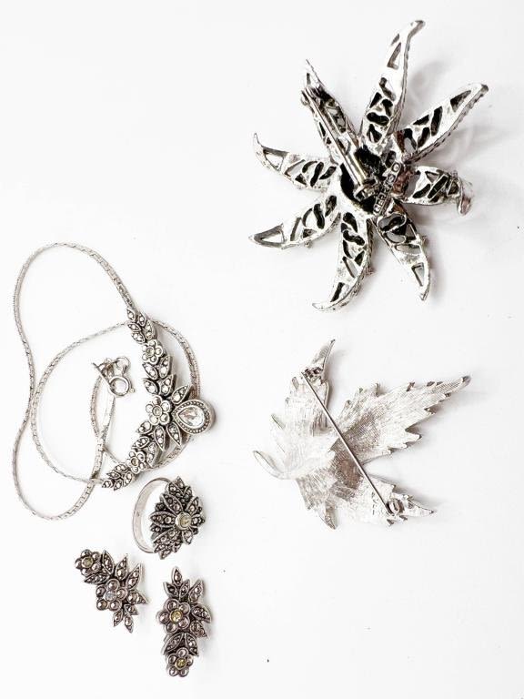 NECLLACE SET, NECKLACE, EARRINGS, RING, PLUS TWO BROOCHES
