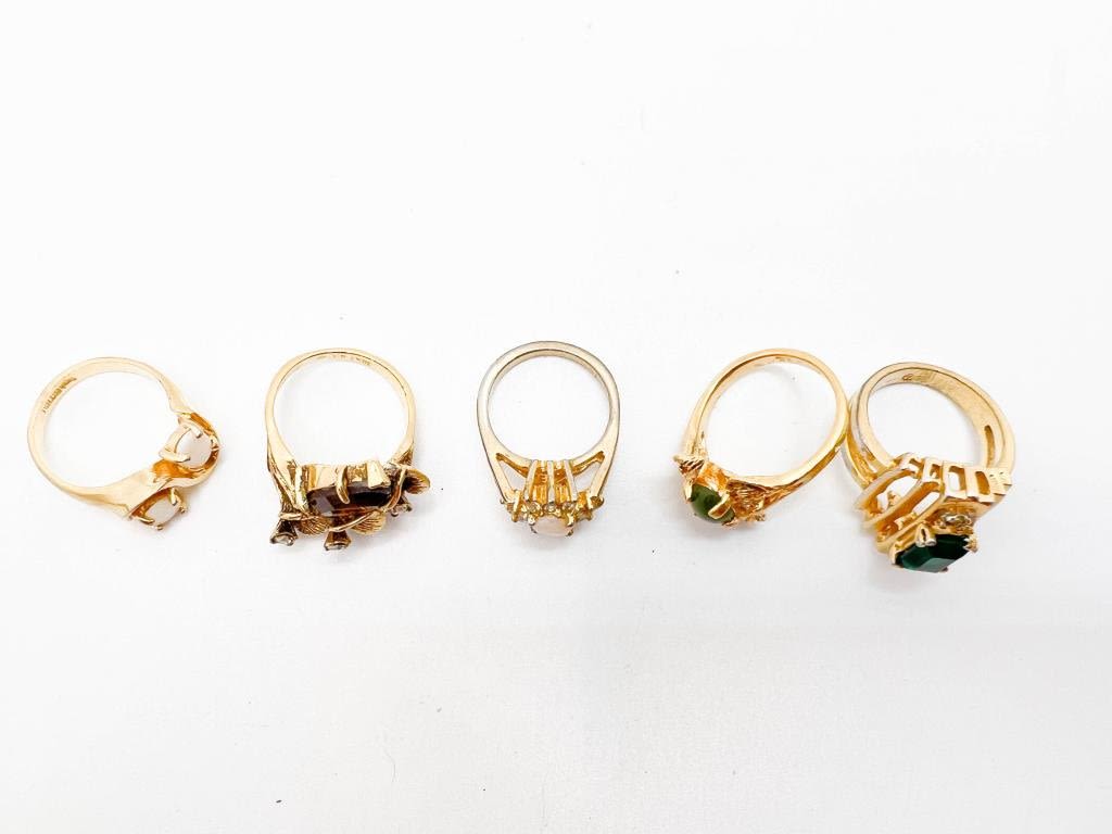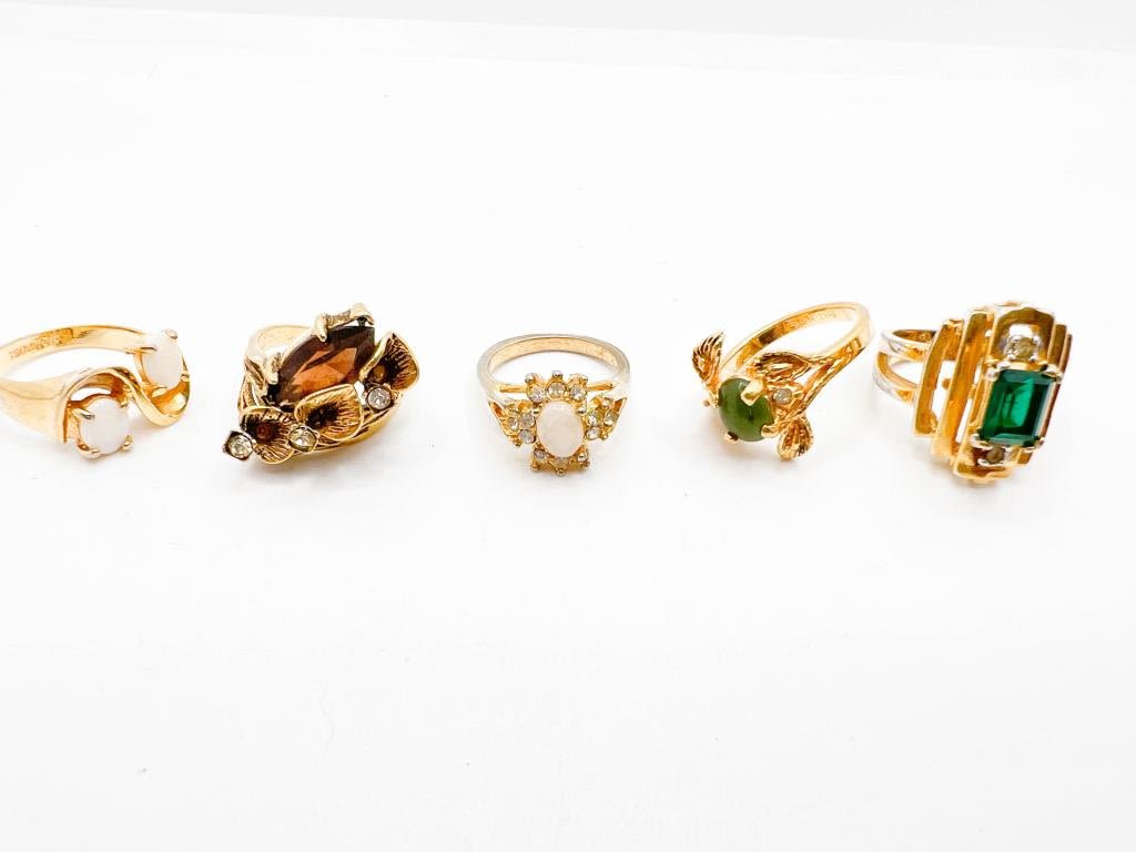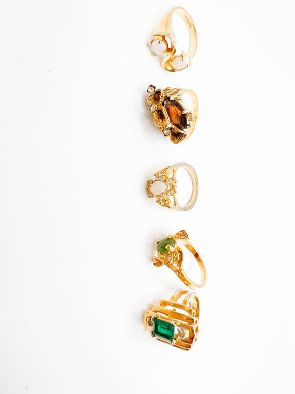 5 ASSORTED GOLD HGE RINGS , MISC STYLES, SIZES, CONDITIONS, SOME WITH STONES