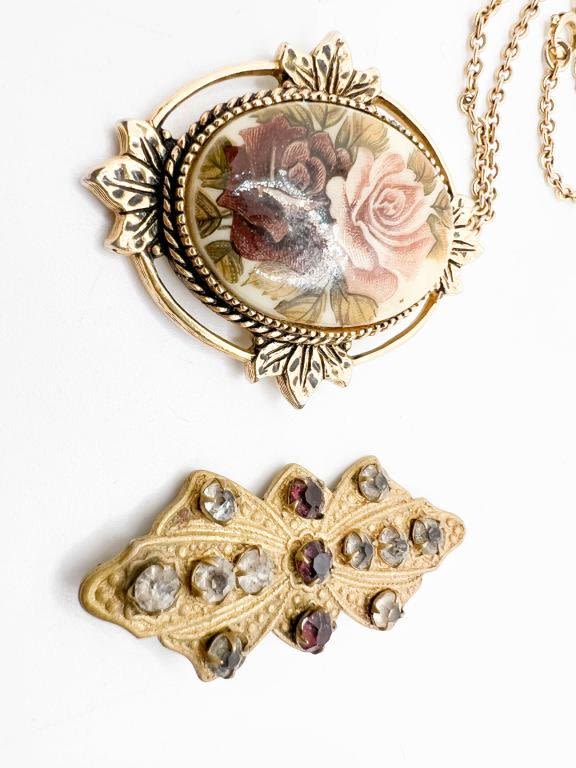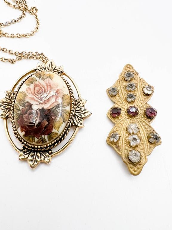ANTIQUE? BROOCH, WITH AMETHYSTS AND CLEAR STONES, C CLASP AND BEAUTIFUL SARAH COVENTRY CAMEO NECKLACE WITH ROSES IN PURPLES AND PINKS