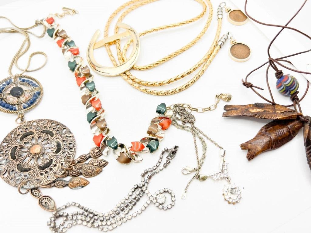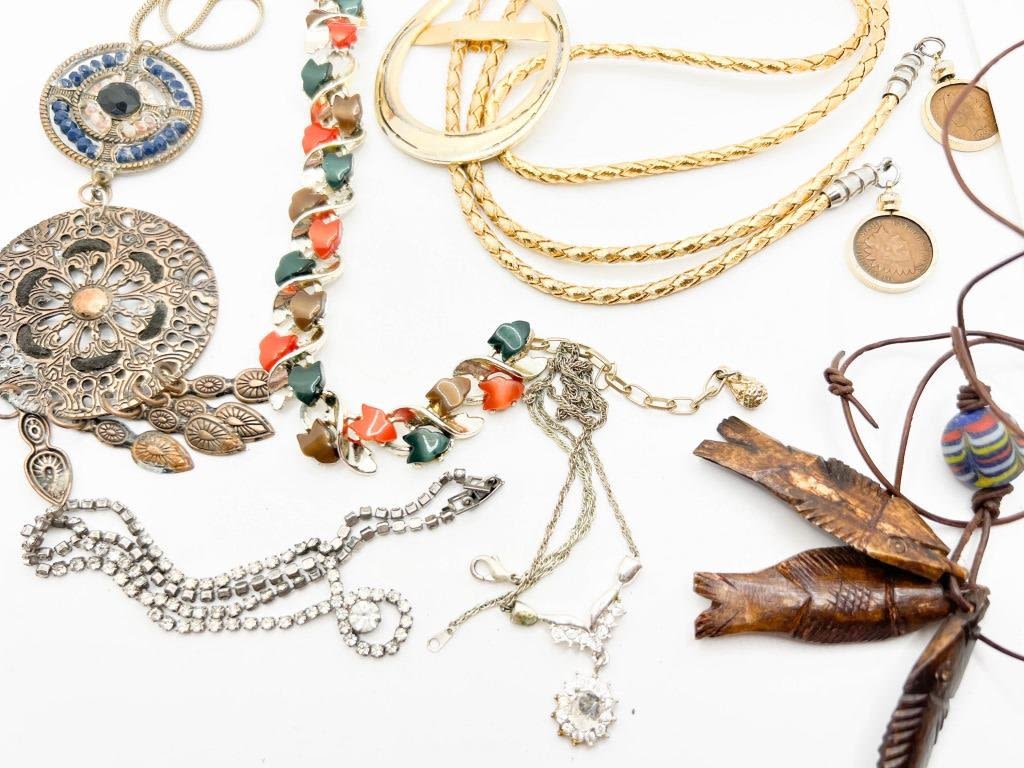MISC NECKLACES ASSORTMENT, WOOD, CARVED FISH, STONES, SCROLLWORK VINTAGE +
