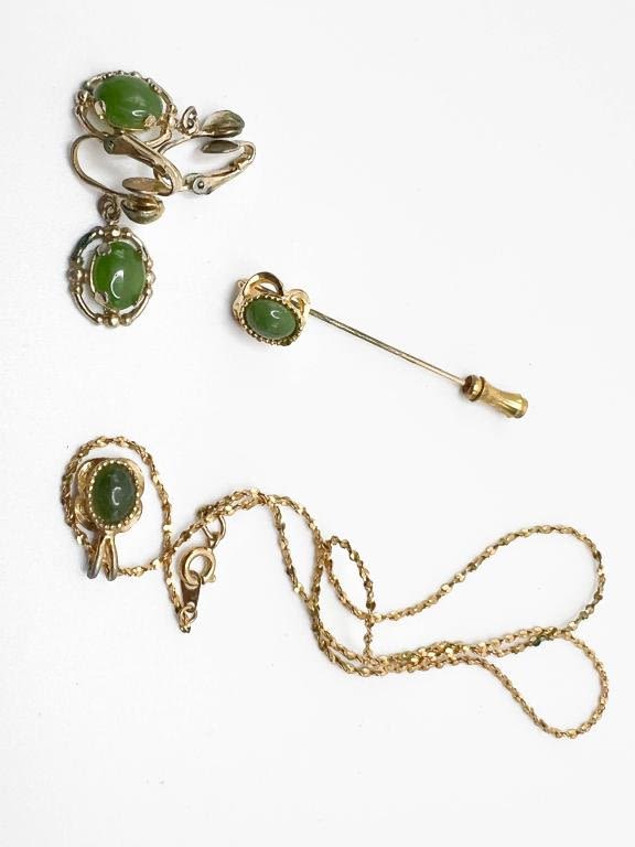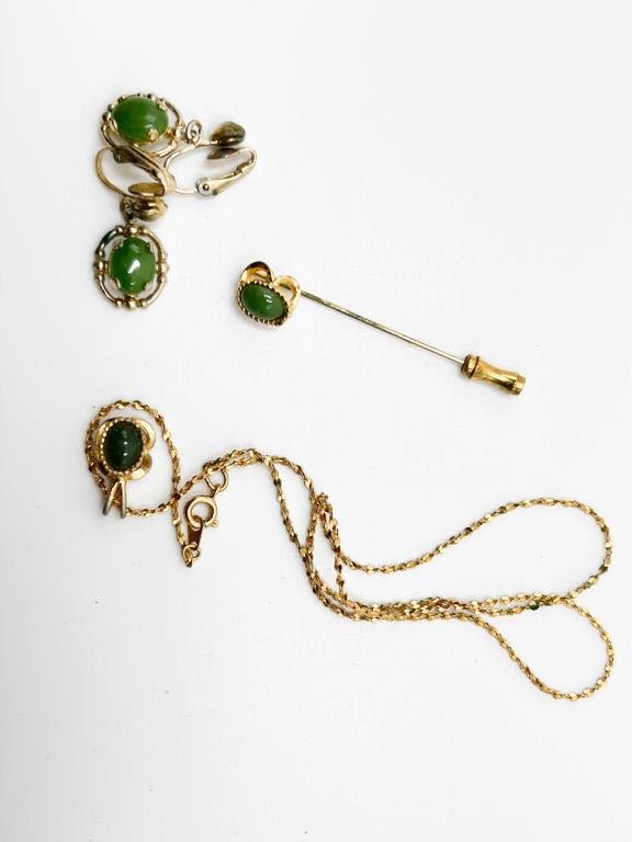 JADE? NECKLACE, EARRINGS + PIN IN GOLD TONES