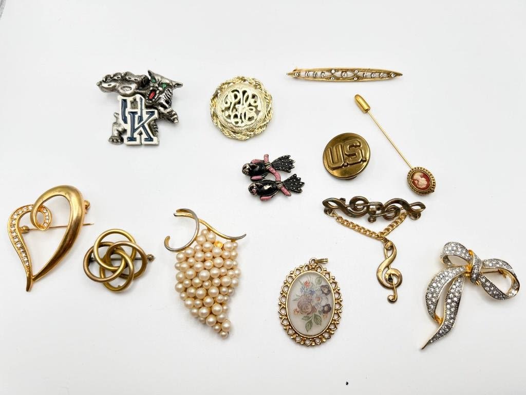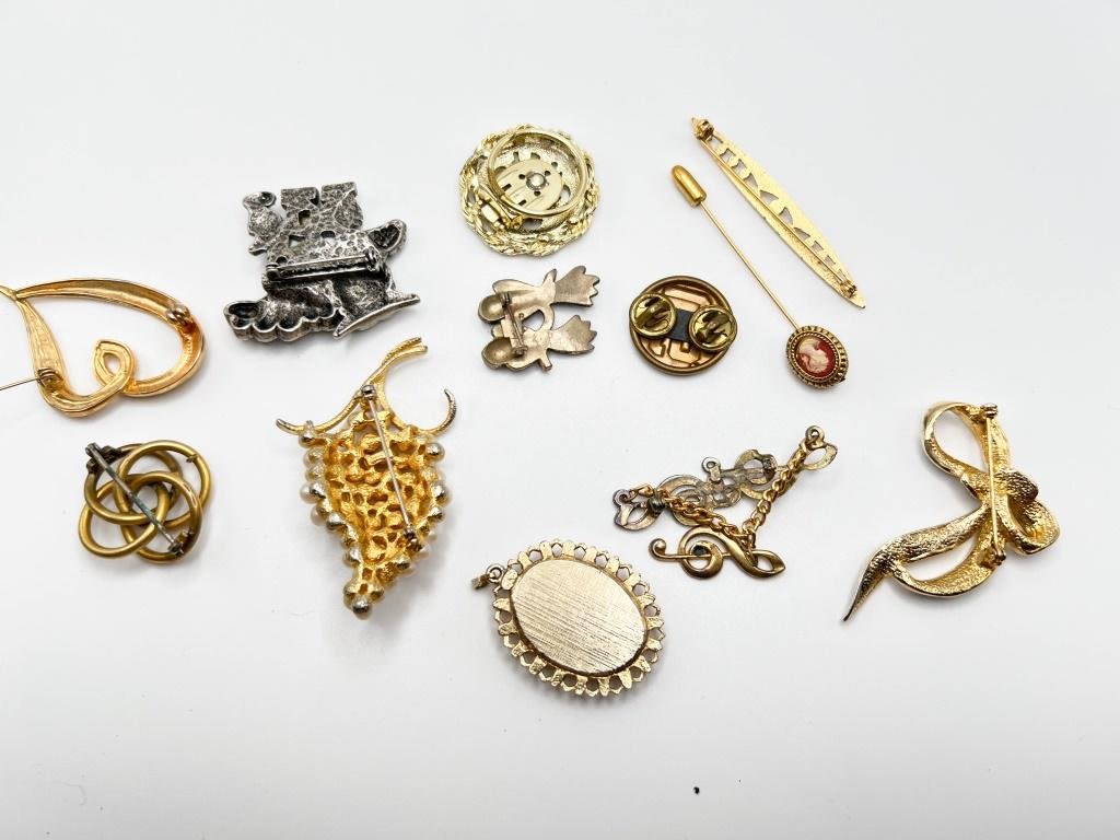 BROOCH ASSORTMENT, HEART, FAUX PEARL, CAMEO, BOWS, + MORE