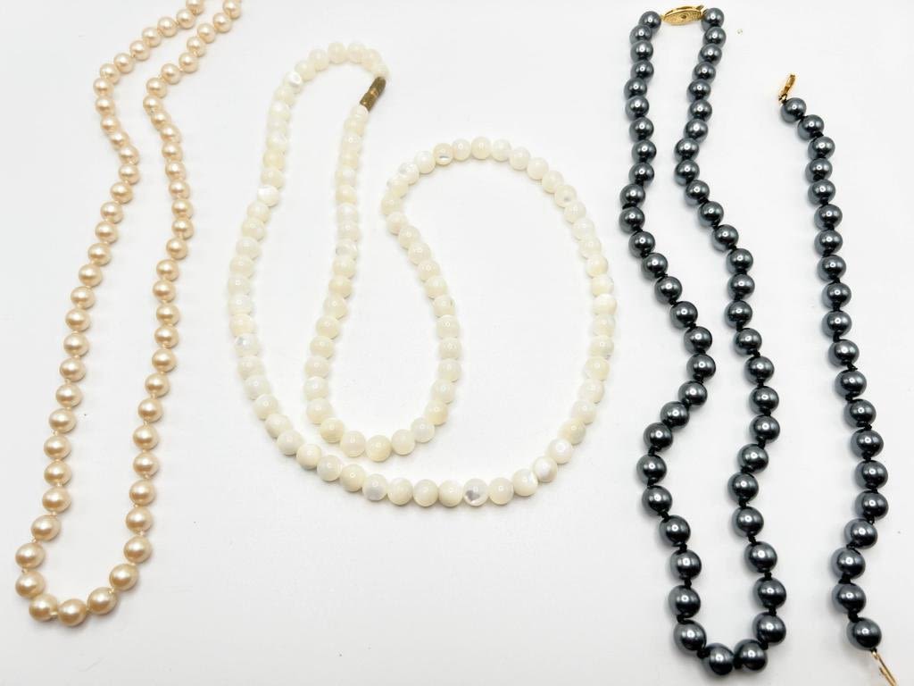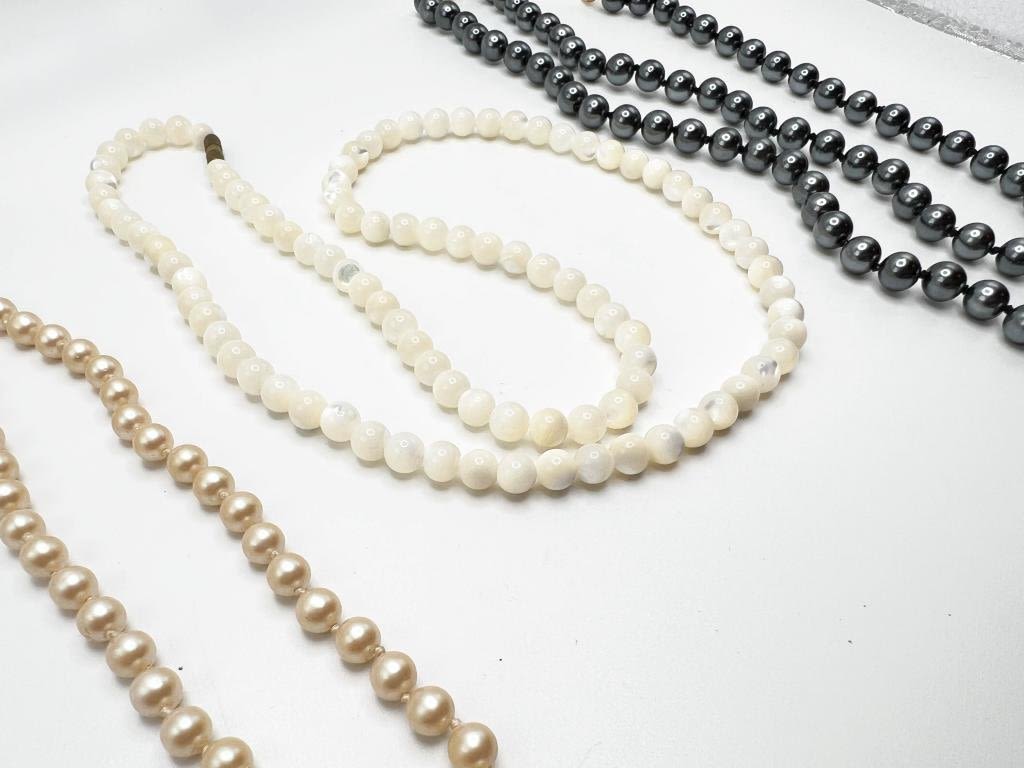 GLASS BEAD NECKLACE , WHITE W GRAY, BLUE, CREAM
