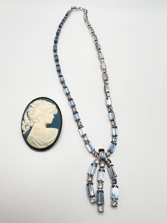 BLUE CAMEO BROOCH AND BLUE RHINESTONE NECKLACE