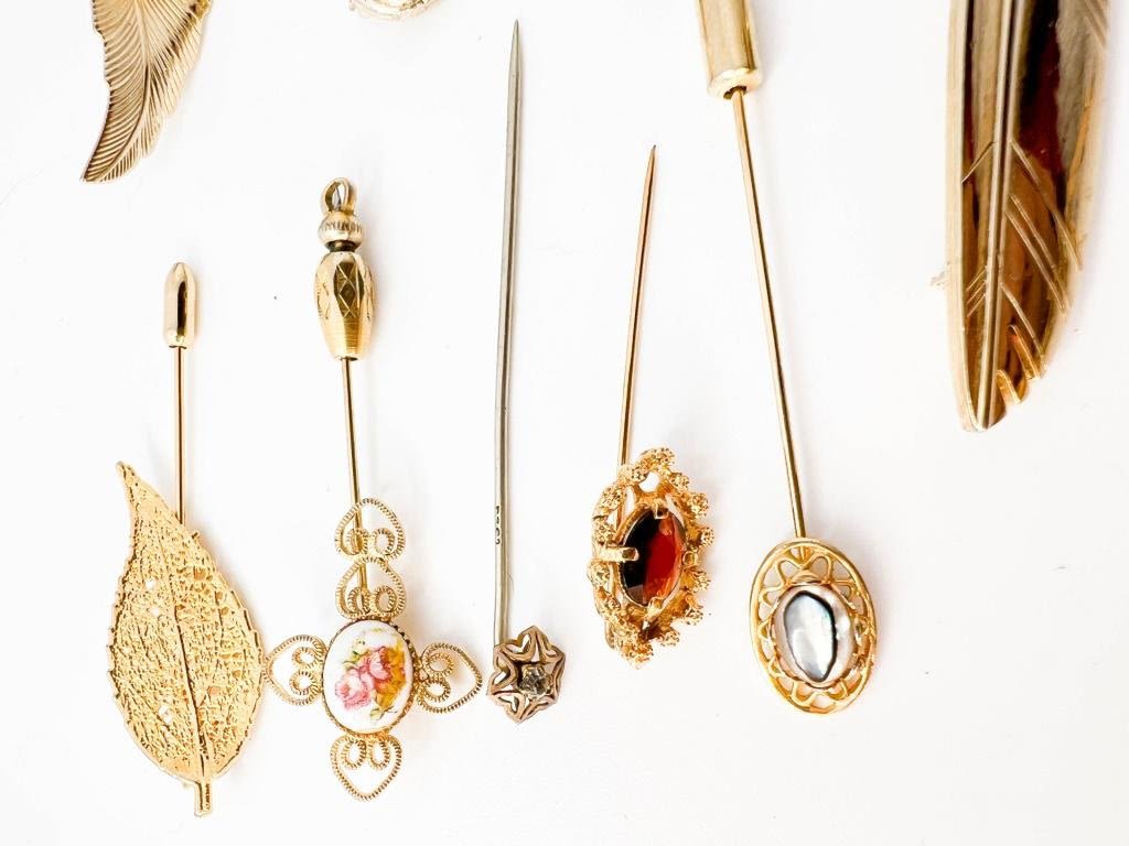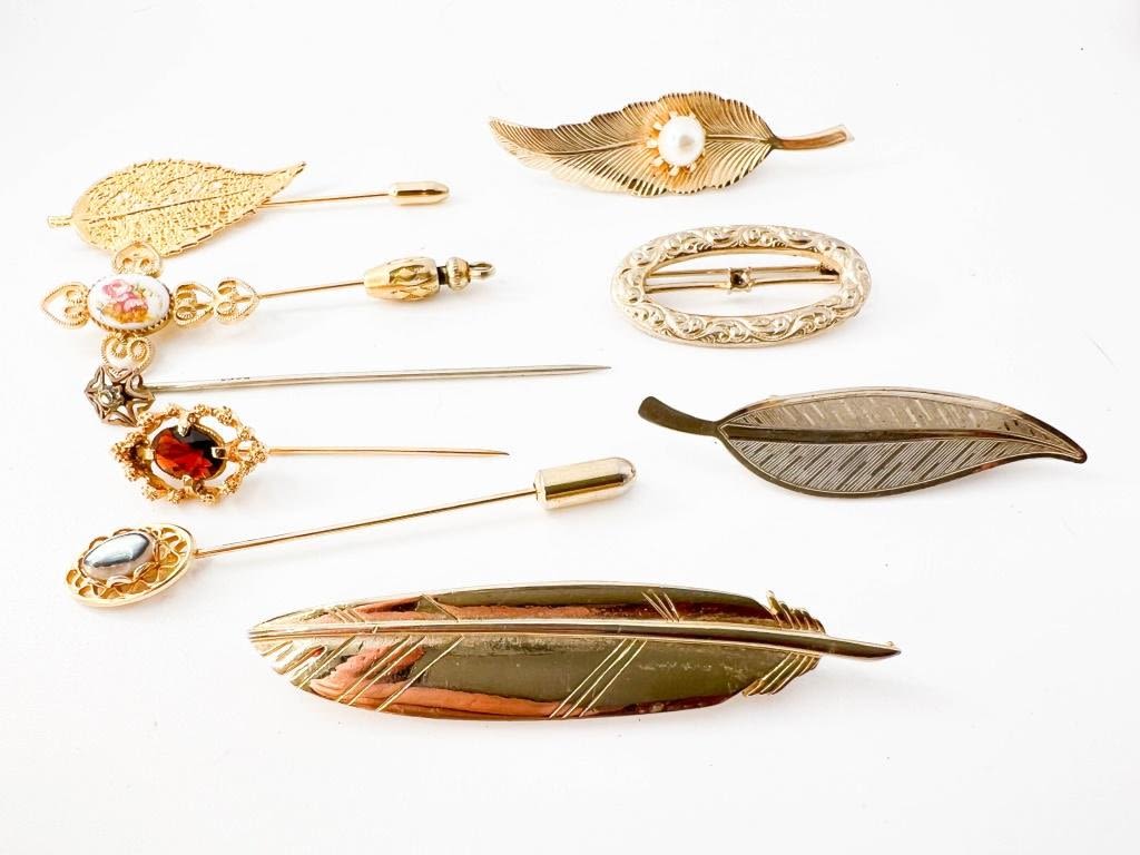 ASSORTED LOT , PINS AND LEAVES , WITH COLOR STONES, GOLD TONES +