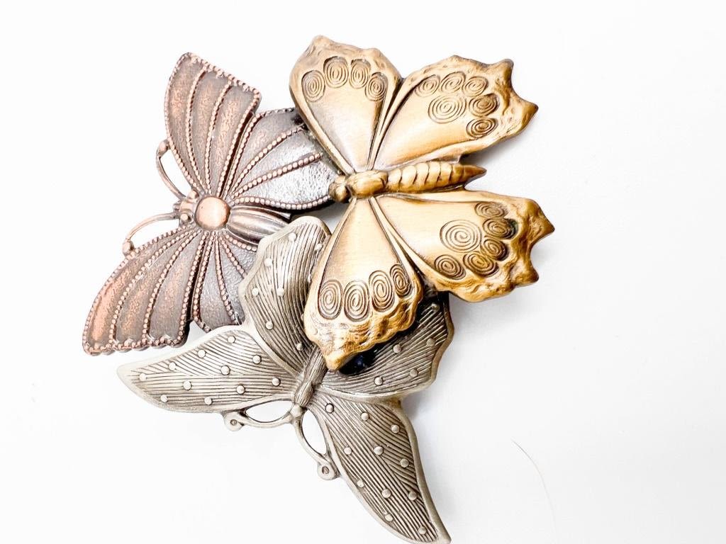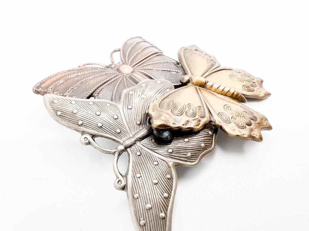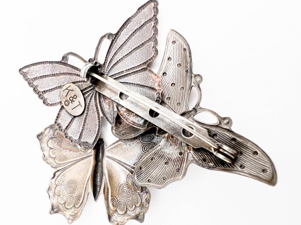 KT SIGNED TRIPLE BUTTERFLY BROOCH, SILVER, COPPER, GOLD COLOR BUTTERFLIES