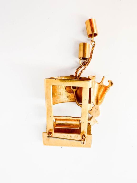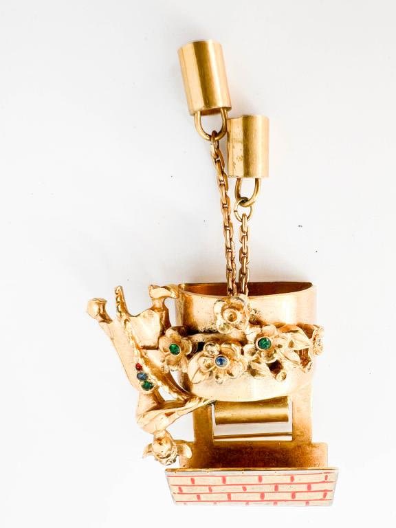 WISHING WELL GOLD TONE BROOCH WITH LADY FIGURINE