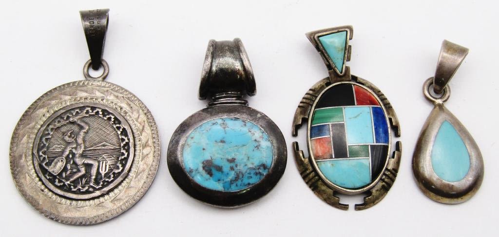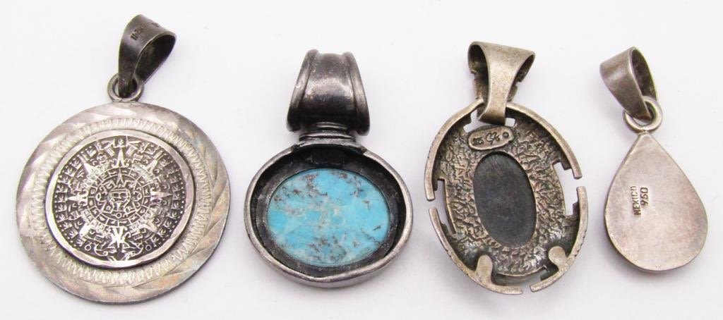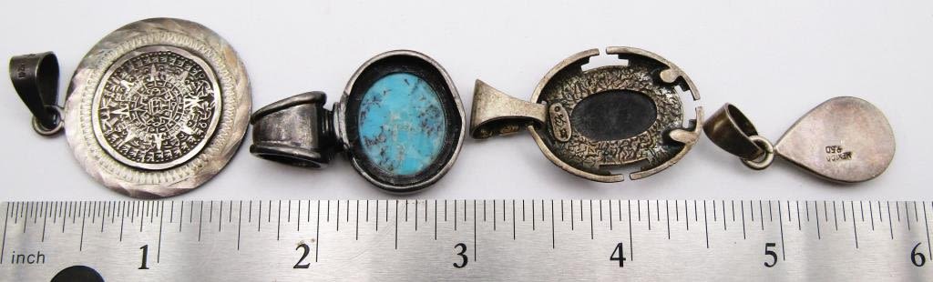 MARKED WITH MULTI STONE GEOMETRIC DESIGN (1)AZTEC (1)MEXICO TEARDROP WITH TURQUOISE INLAY (1)SLIDER WITH TURQUOISE INLAY-TOTAL 22 DWT