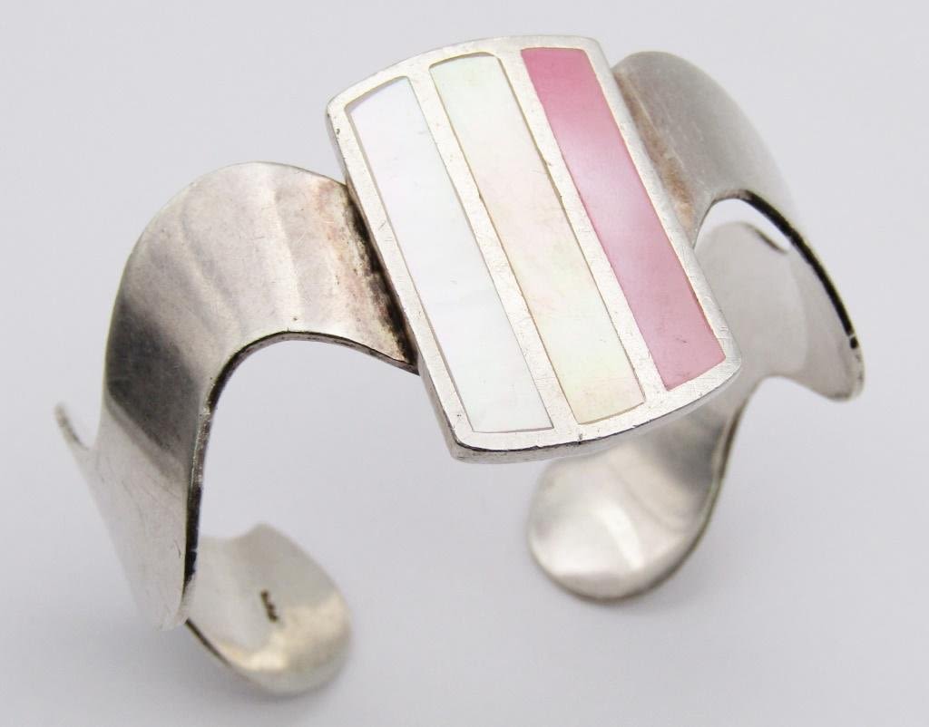 WHITE STONE INLAY DESIGN-LOOKS NEW! MEASURES 7.5 INCHES WITH GAP-TOTAL 25 DWT