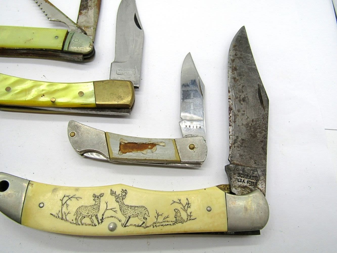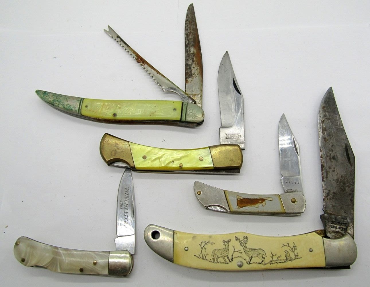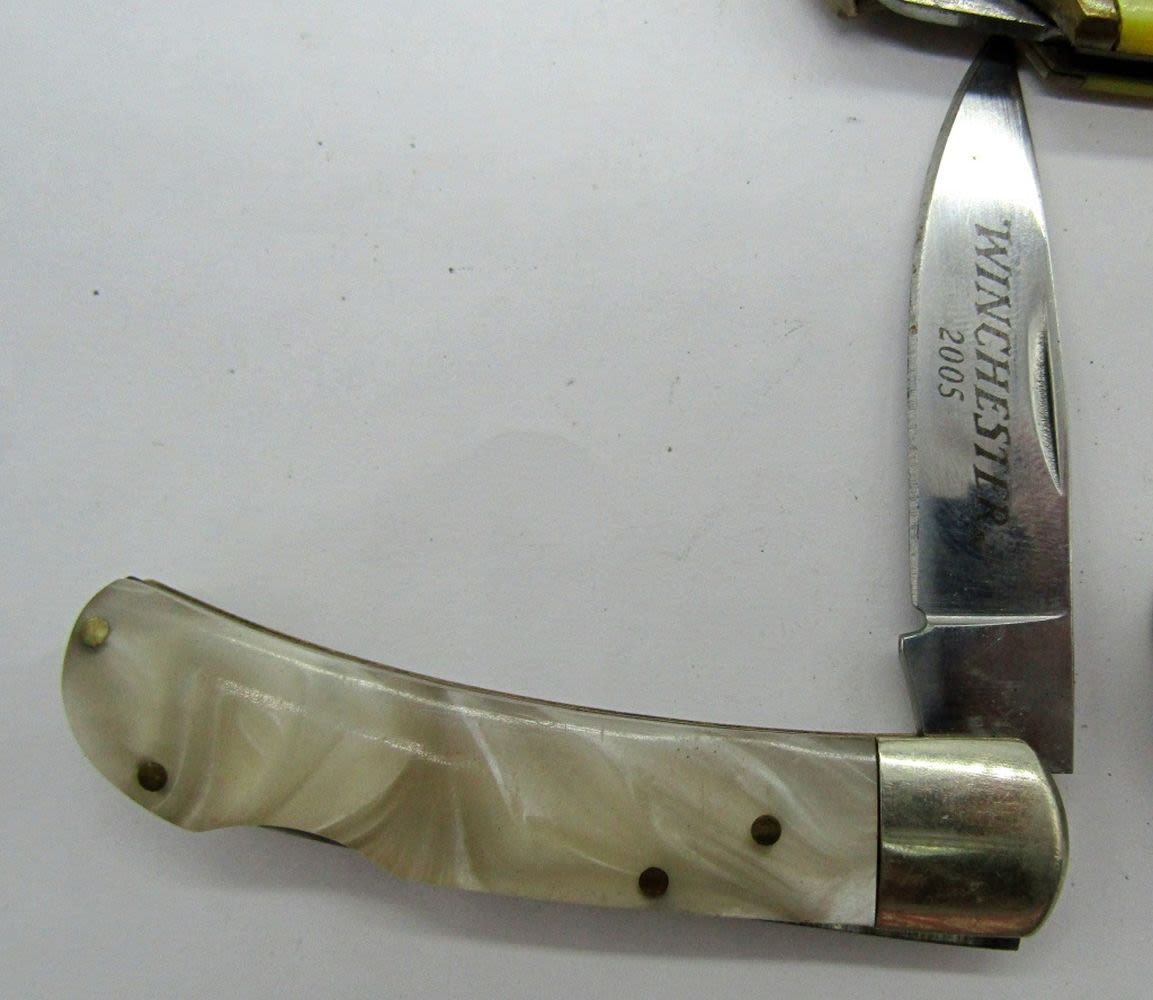 DEER SCENE, WINCHESTER 2005 (1) BLADE, #VB224 (1) BLADE-PAKISTAN, (1) BLADE LOCK BACK PAKISTAN, (1) CUT MASTER FISH KNIFE