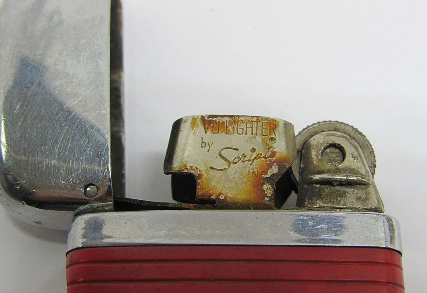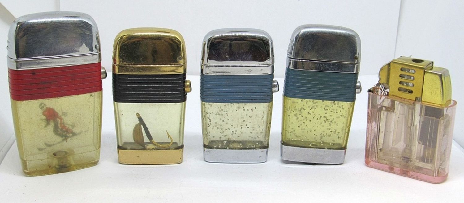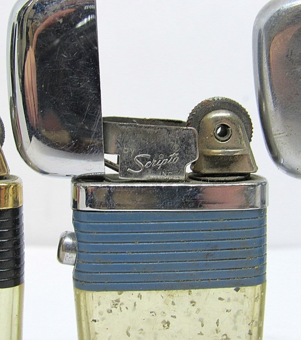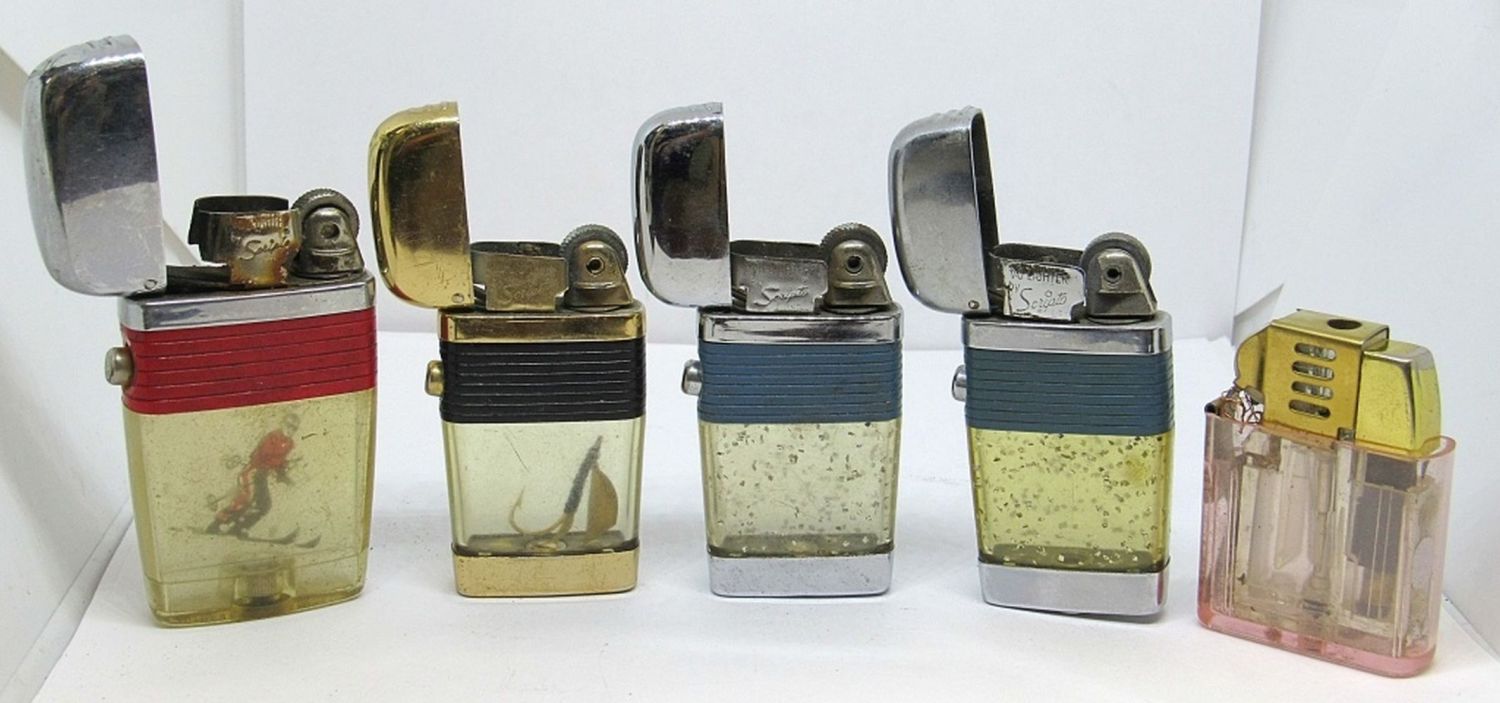 FOUR SCRIPTO LIGHTERS AND ONE UNMARKED. UNTESTED AS TO WORKING. INTERESTING SET!