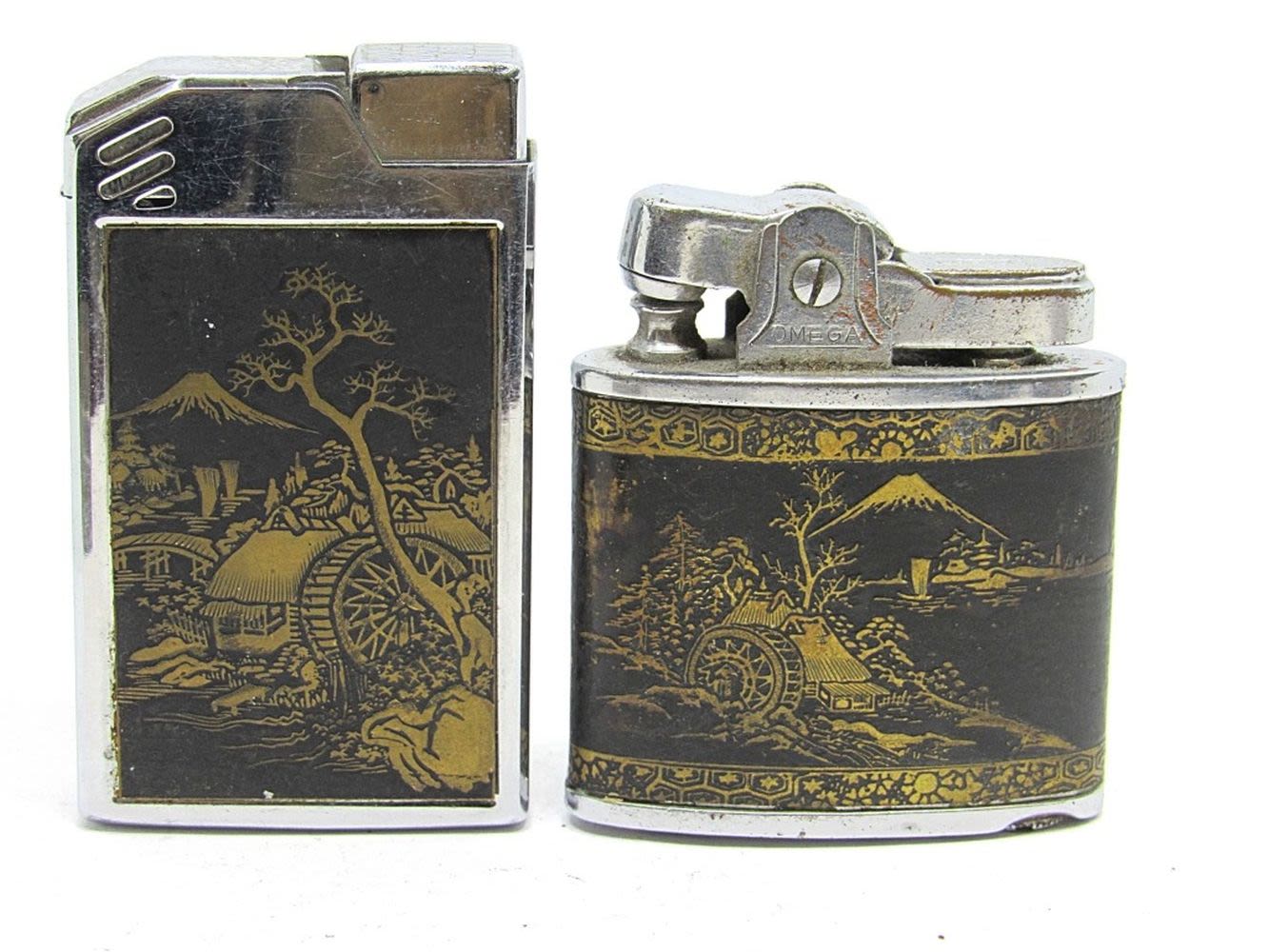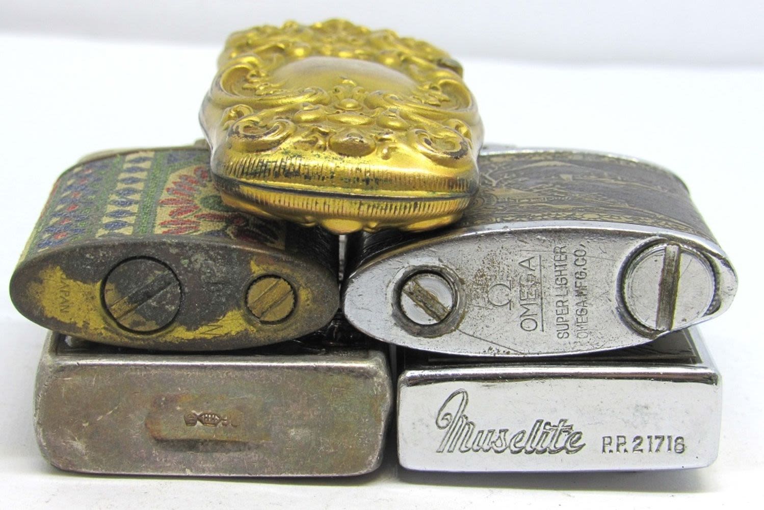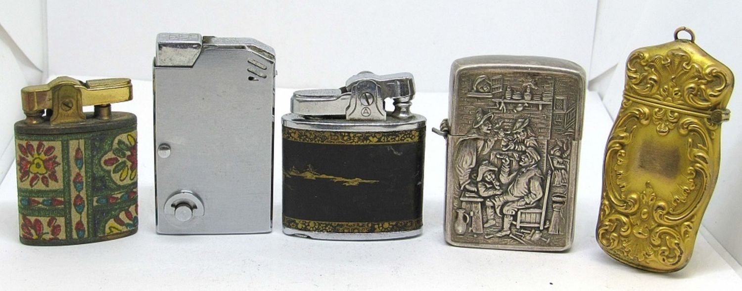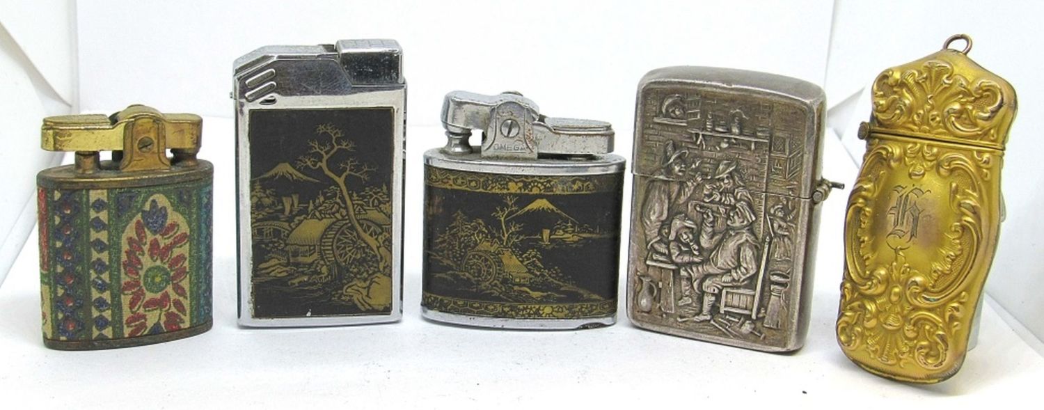 ONE VINTAGE CASE AND FOUR LIGHTERS. MULTIPLE BRANDS INCLUDING OMEGA AND MUSELITE. ALL UNTESTED AND PRE-OWNED.