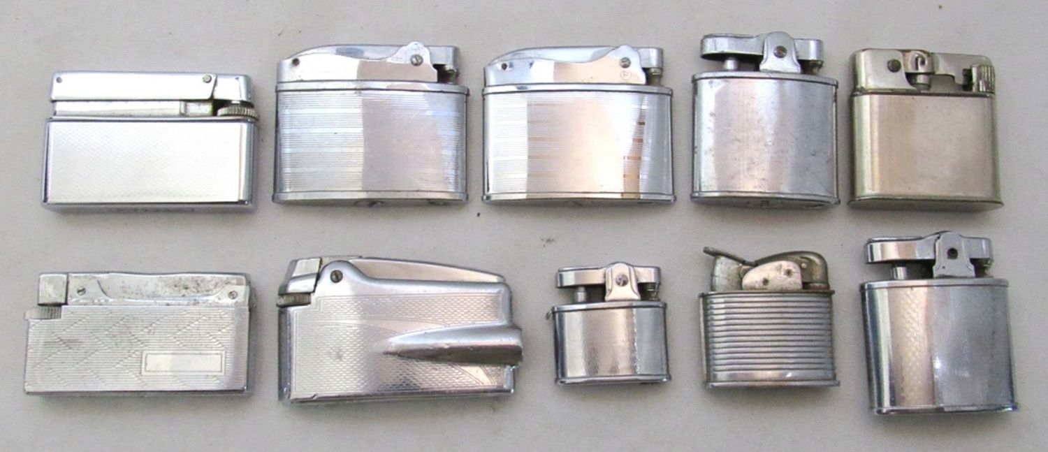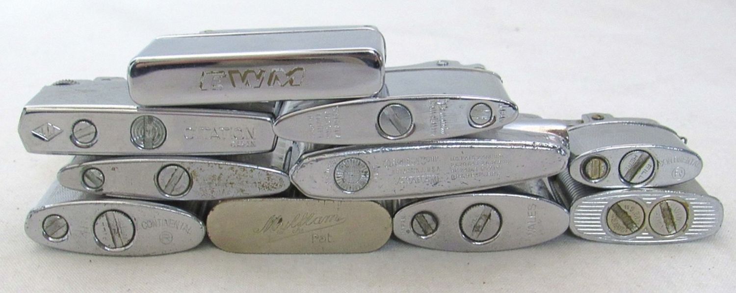 10 VINTAGE LOOKING LIGHTERS ALL WITH SIMILAR DESIGNS. INCLUDES BRANDS LIKE CITATION, CORONET, CONTINENTAL, PENGUINE, AND MORE! ALL UNTESTED