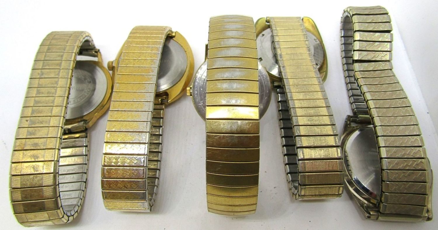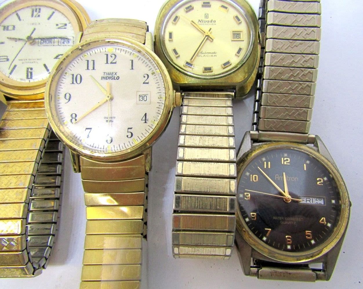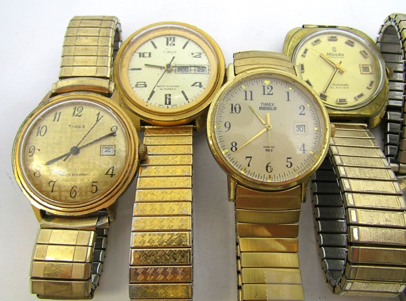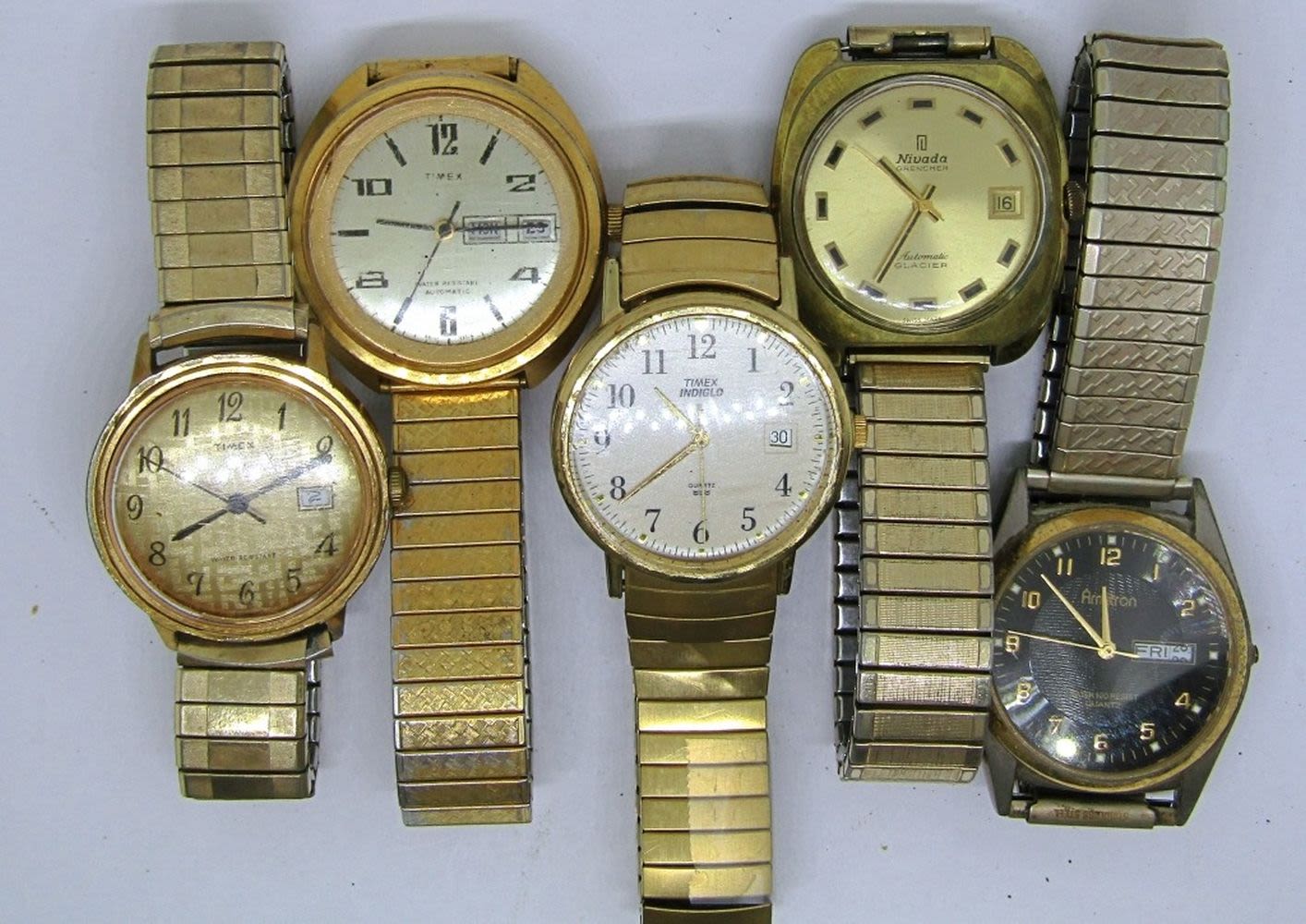 WITH STRETCHY BANDS: TIMEX WR AUTOMATIC DAY DATE-TIMEX WR CALENDAR (RUNNING)-NIVADA GRENCHEN AUTOMATIC GLACIER CALENDAR-TIMEX INDIGLO CALENDAR-ARMITRON WR DAY DATE-ALL WATCHES UNTESTED