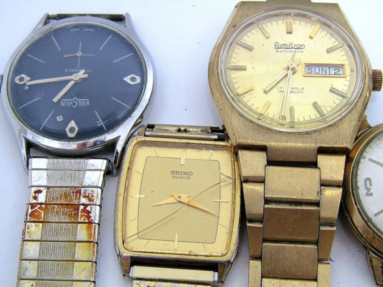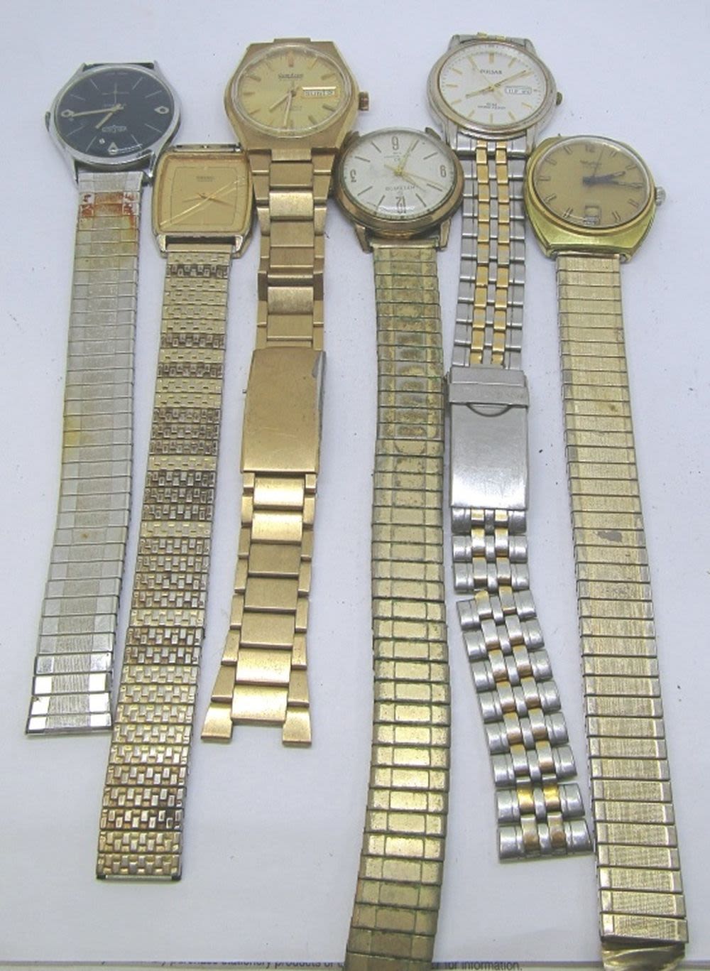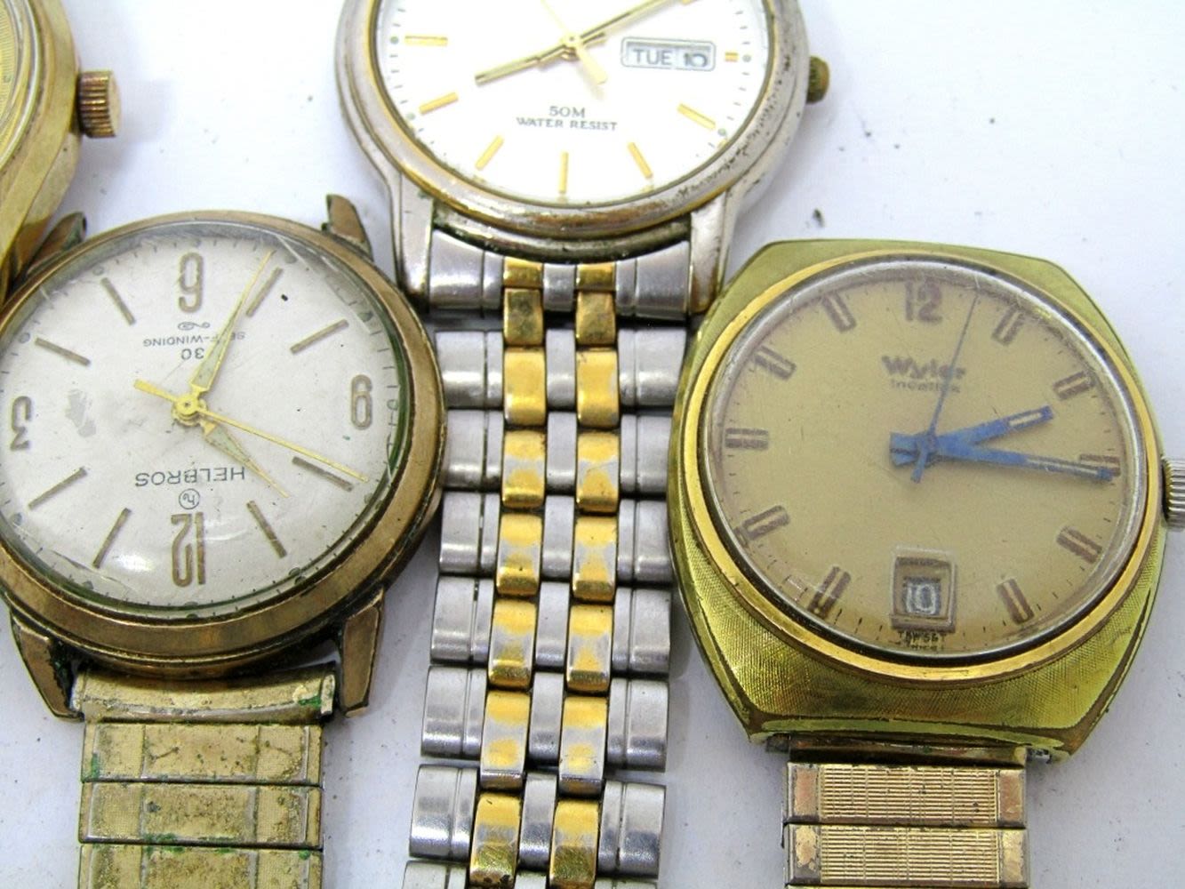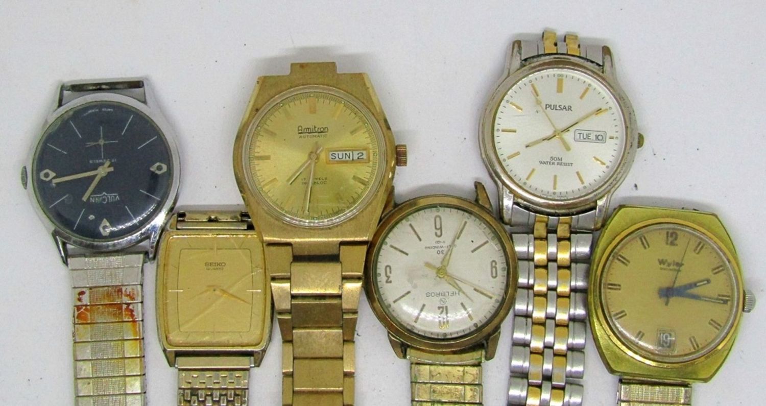 WYLER CALENDAR (RUNNING)VULCAIN 17 JEWELS-SEIKO-HELBROS 30 SELF WINDING-PULSAR 50 WR DAY DATE-ARMITRON 17 JEWELS DAY DATE-ALL WATCHES UNTESTED/PARTS/REPAIR