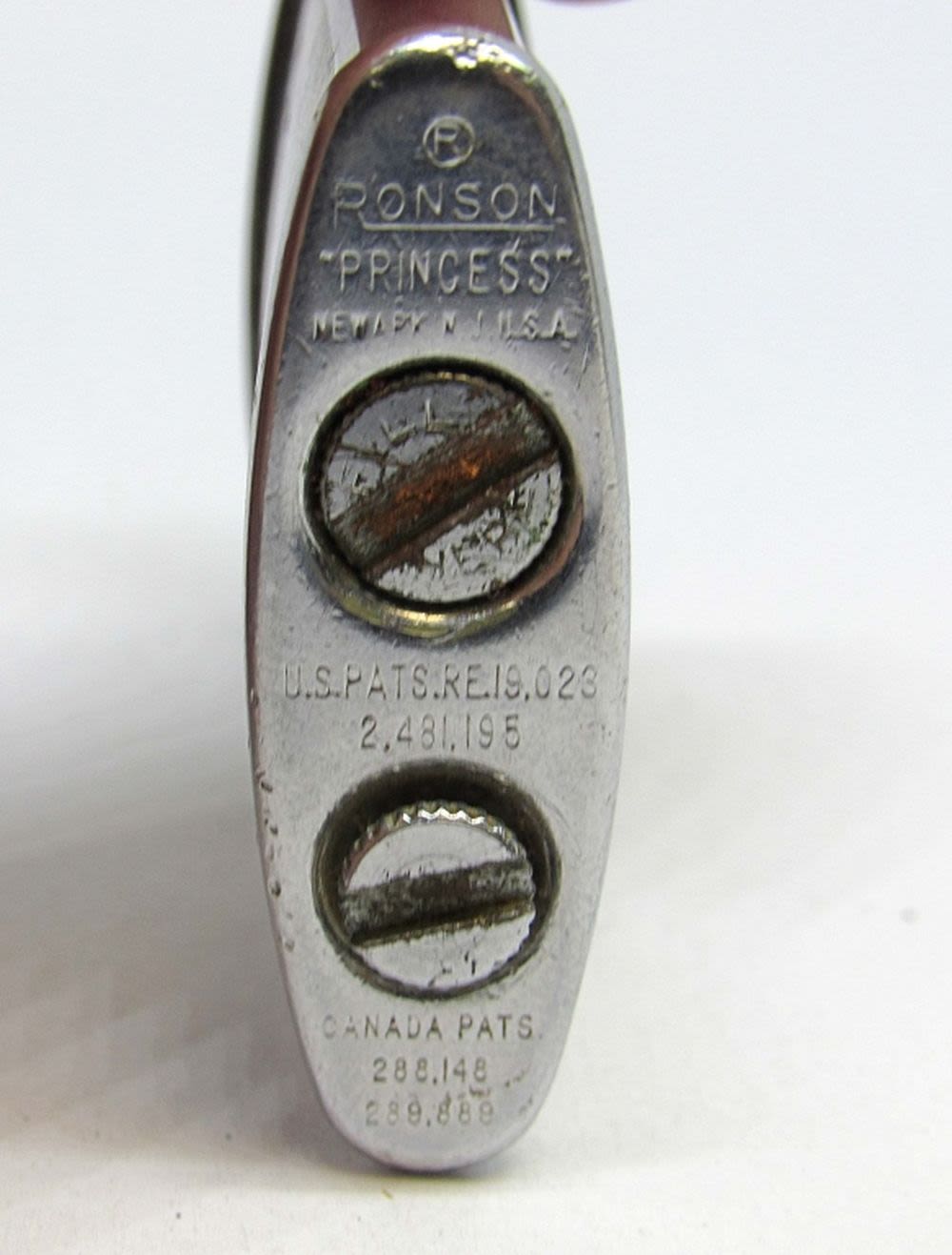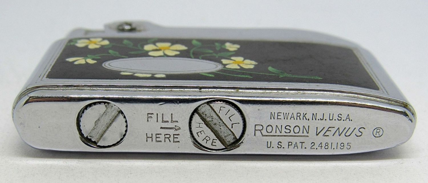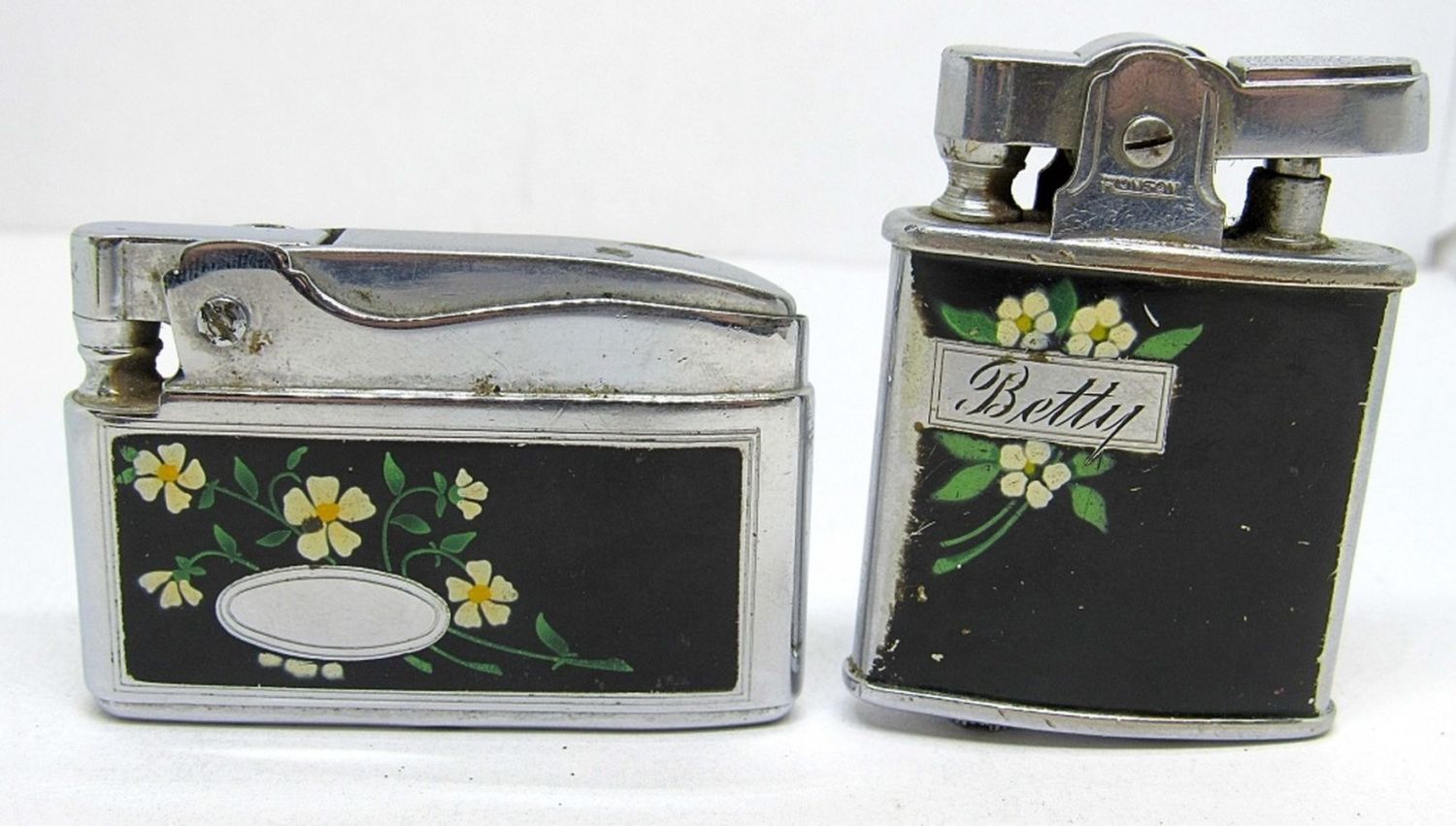 A PAIR OF BLACK FLORAL LIGHTERS. ONE IS A VINTAGE RONSON “PRINCESS” LIGHTER, AND THE OTHER IS RONSON “VENUS” LIGHTER. UNTESTED
