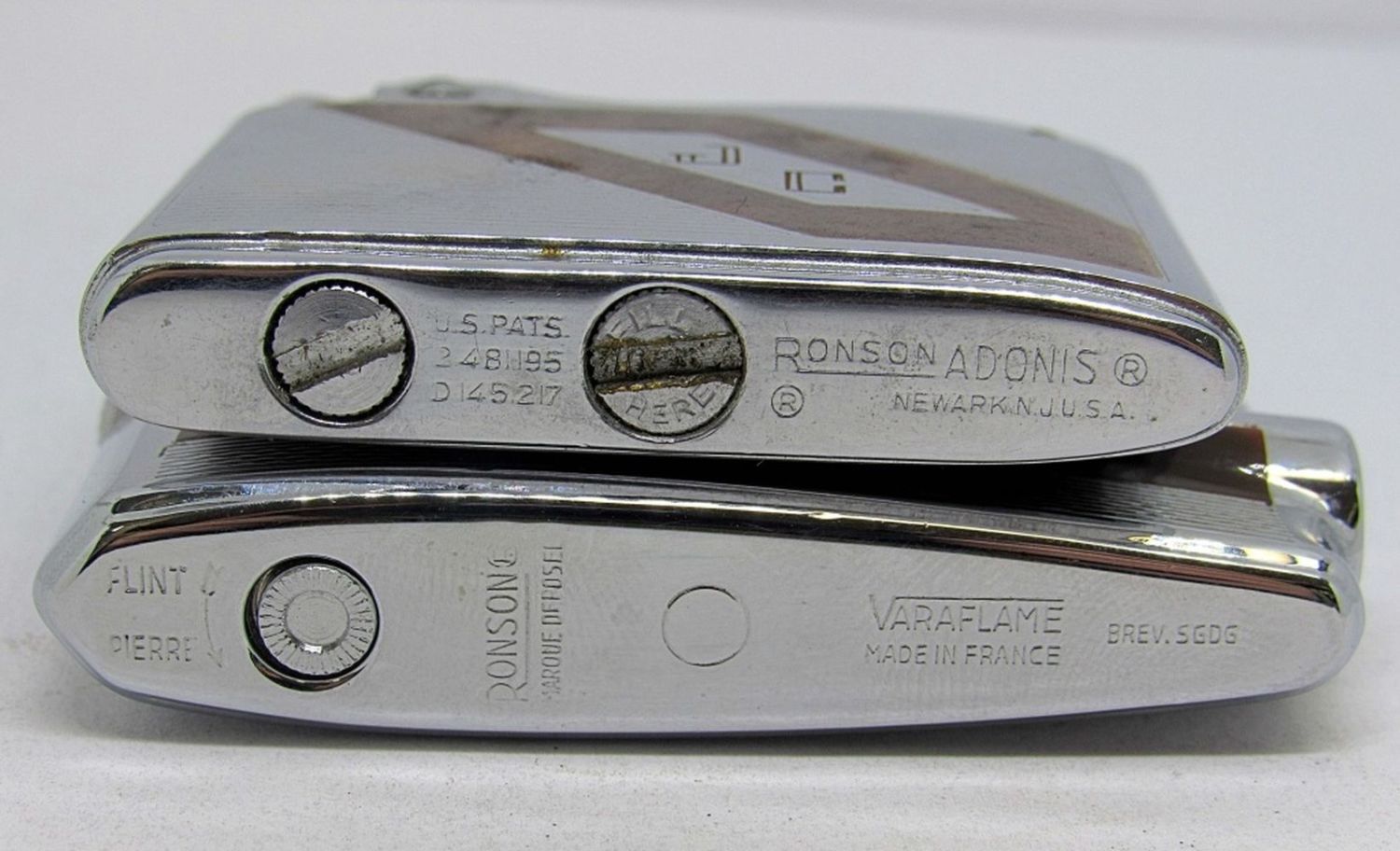 SILVER AND BROWN TRIM LIGHTERS, ONE IS “ADONIS” AND THE OTHER IS A VARAFLAME LIGHTER. GOOD CONDITION, AND UNTESTED