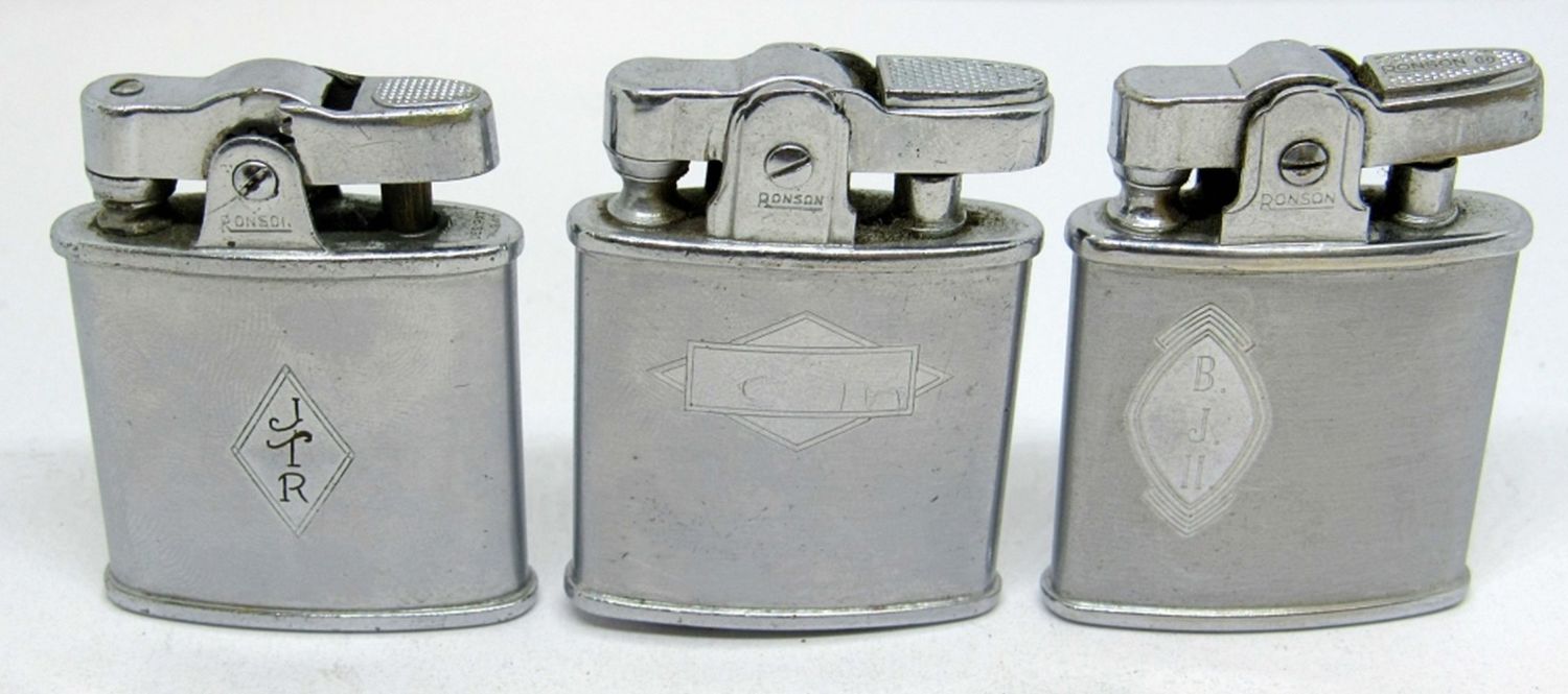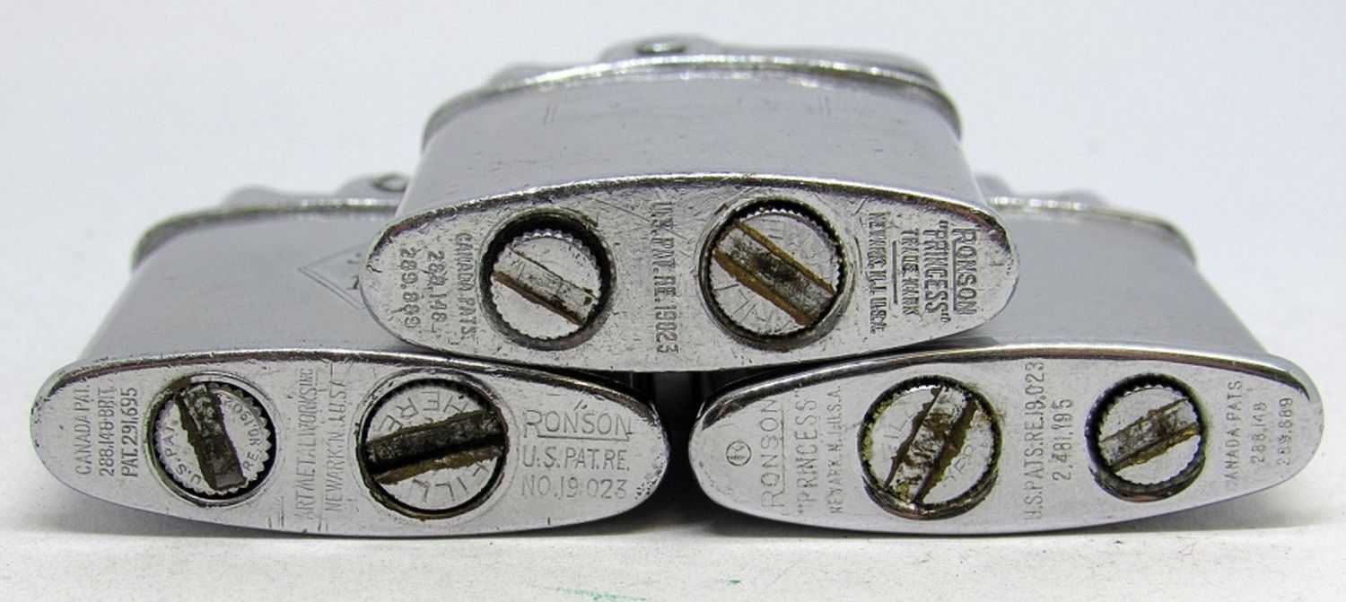 TWO RONSON “PRINCESS” LIGHTERS AND ONE PLAIN ONE. ALL IN NICE CONDITION AND UNTESTED. NICE SILVER TONED SET.