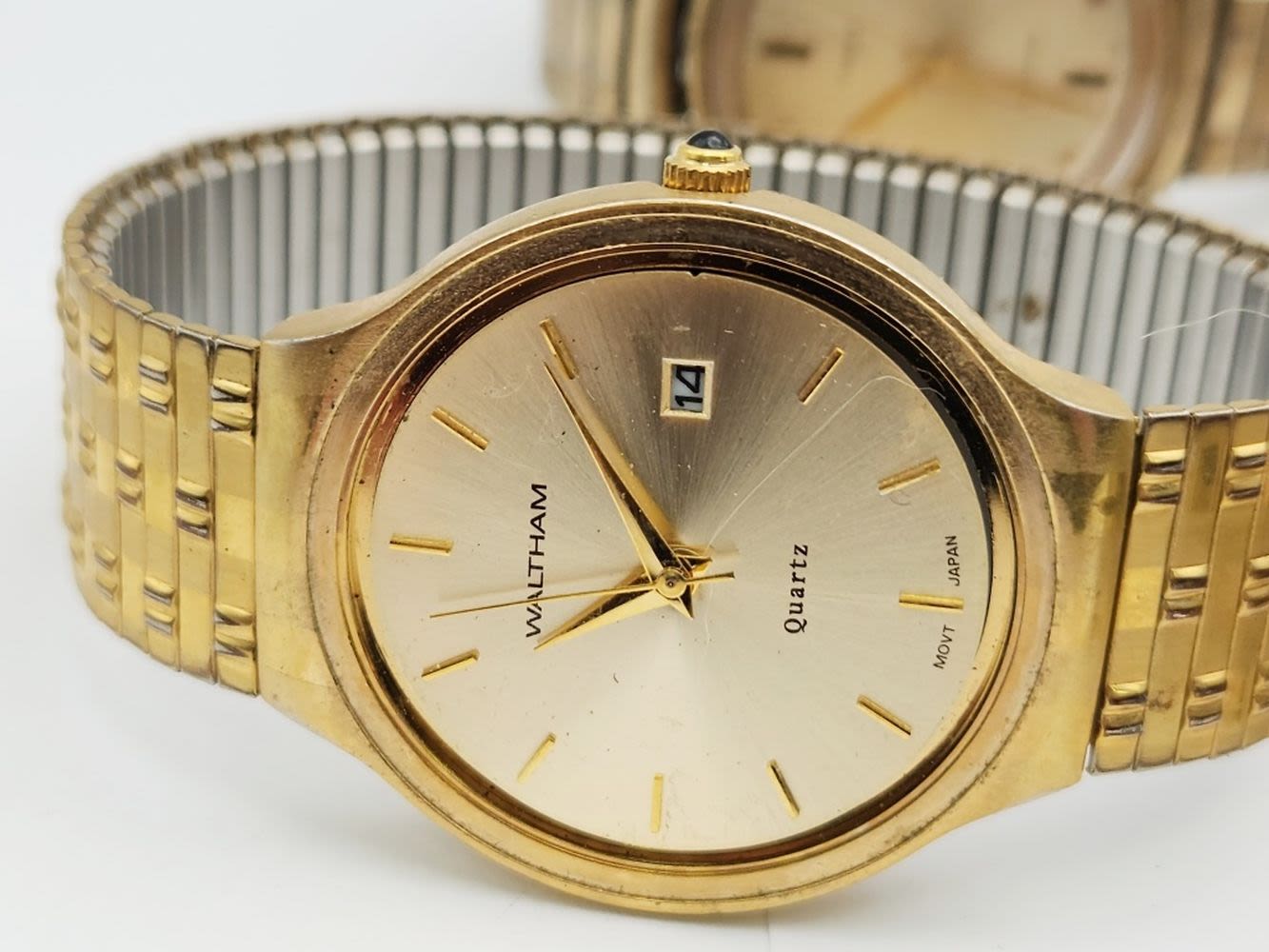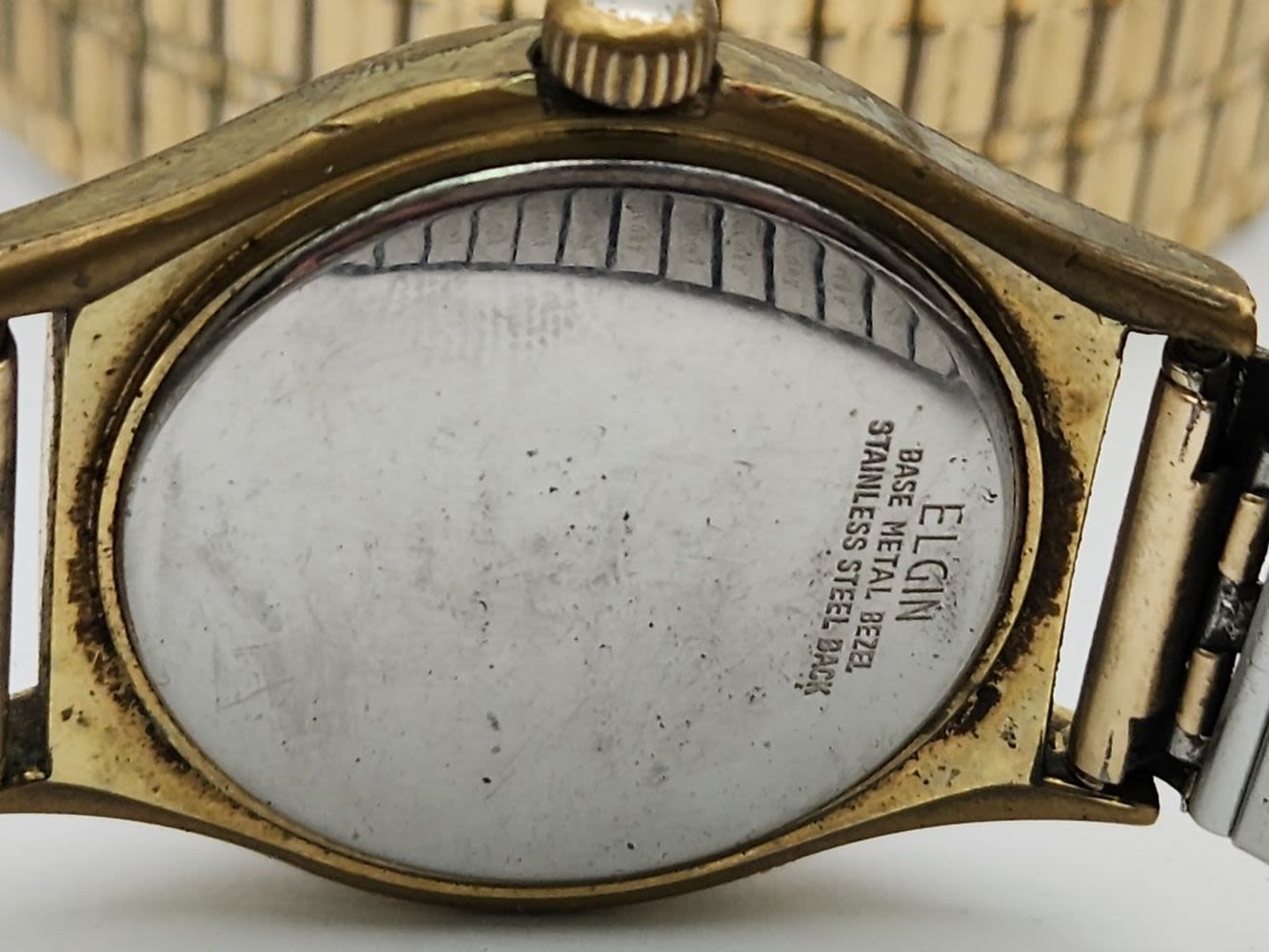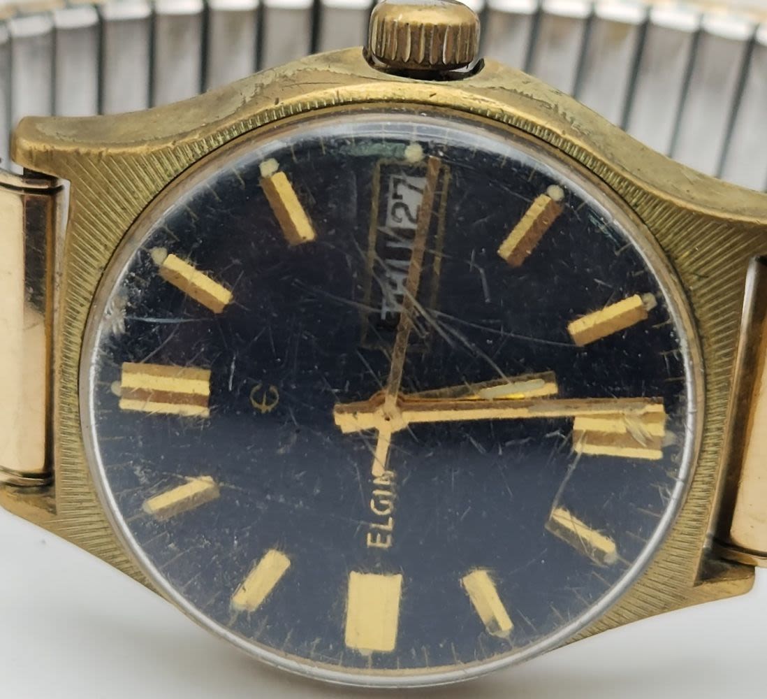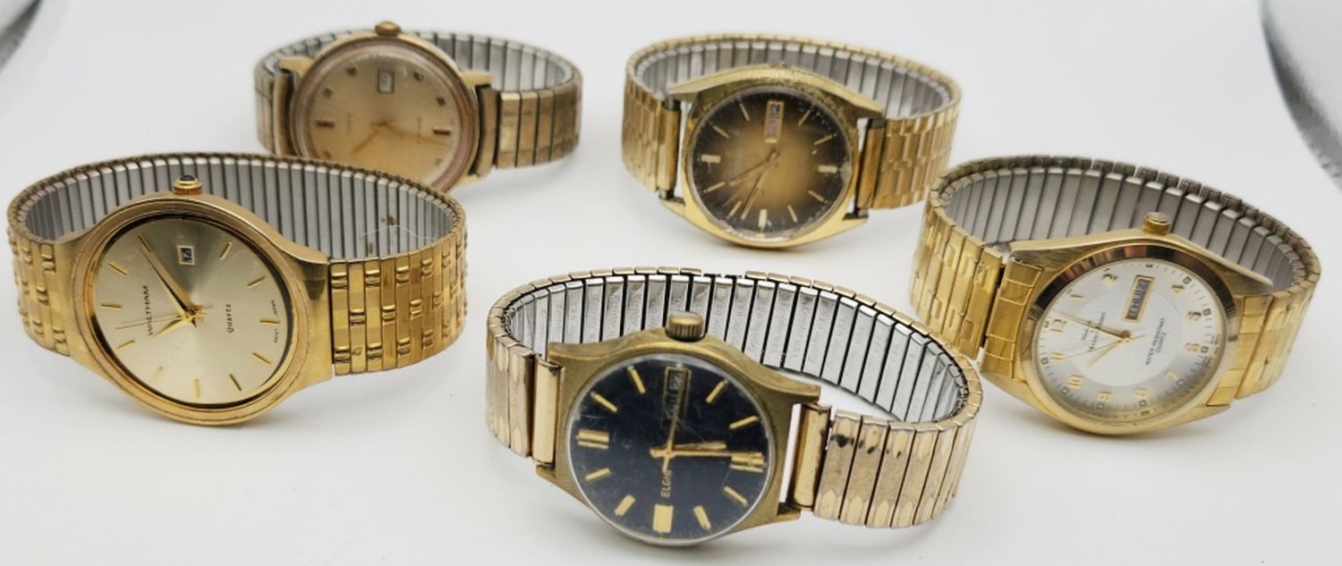 STRETCHY BANDS: WALTHAM QUARTZ CALENDAR-PHASAR DAY DATE QUARTZ-MADISON WR QUARTZ DAY DATE-TIMEX SELF WIND CALENDAR-ELGIN DAY DATE-ALL WATCHES UNTESTED