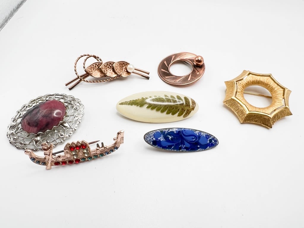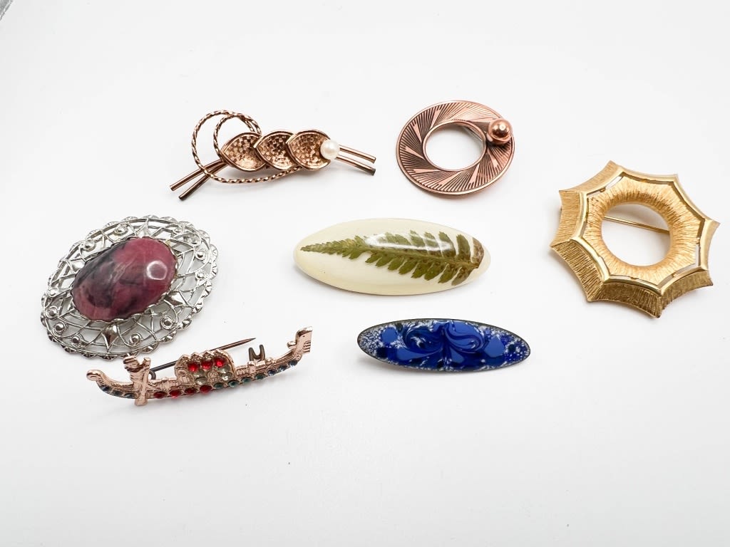 ASSORTED BROOCHES, FLORAL, CIRCLES, STONE , BOAT ++