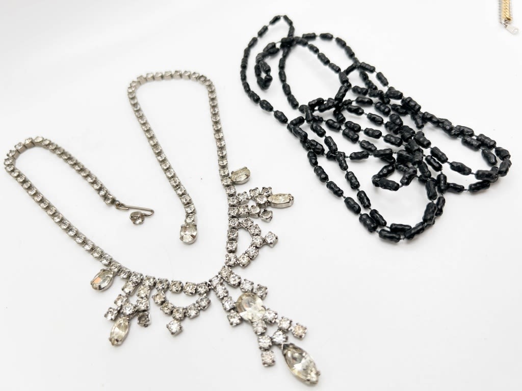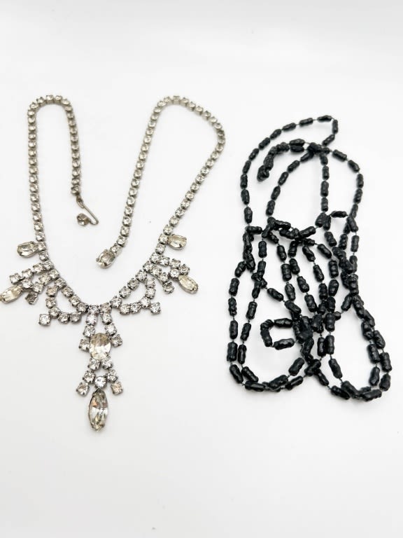 BEAUITFUL RHINESTONE NECKLACE, DRAPE STYLE, + FAUX BLACK SEED PEARL NECKLACE