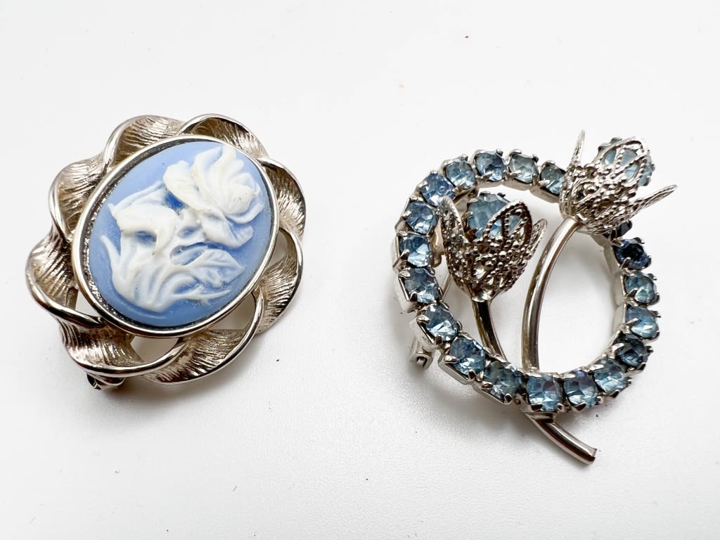 SKY BLUE CAMEO AND WHITE, SKY BLUE RHINESTONE BROOCHES , BEAUTIFUL