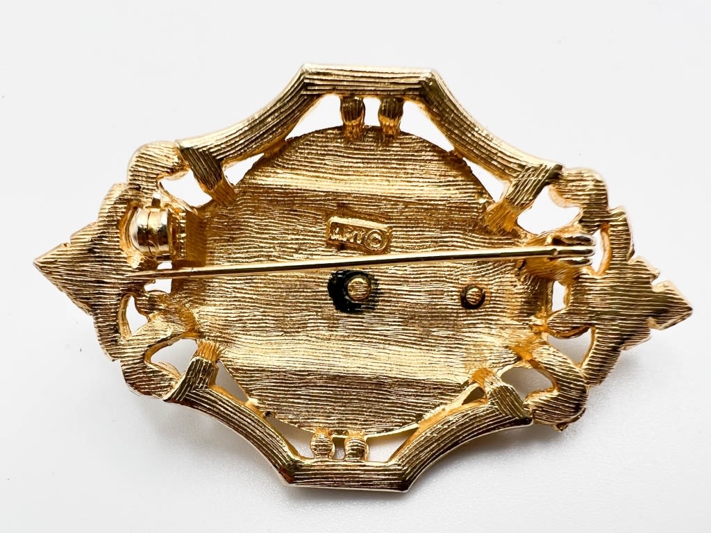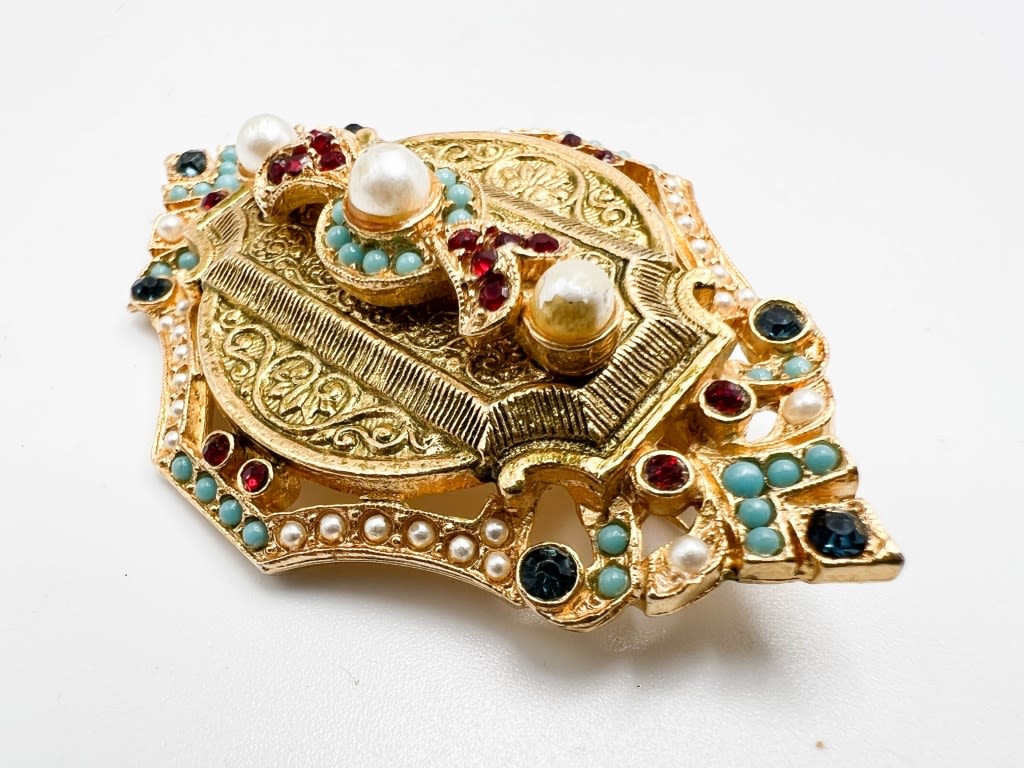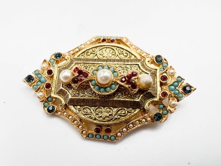 ART SIGNED VINTAGE BROOCH , PEARL AND COLOR STONES
