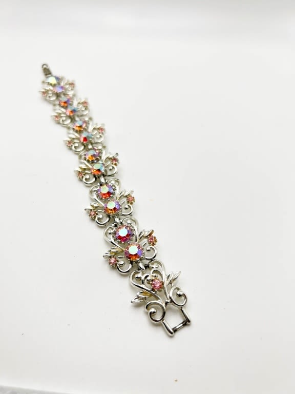 PRETTY STONE CORO SIGNED BRACELET WITH GORGEOUS STONES SETTINGON SCROLL SILVER TONE BRACELET