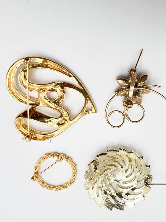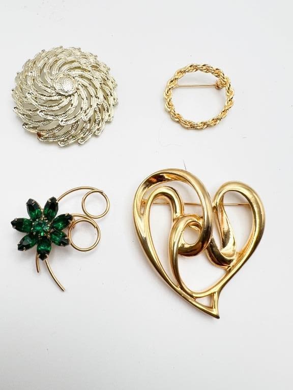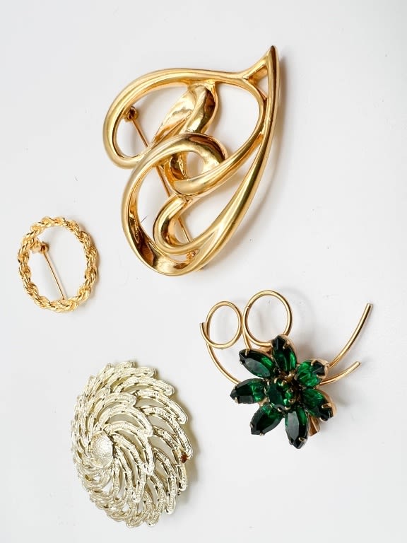VINTAGE BROOCH LOT, FLORAL, SPIRAL, HEART , GREEN STONES