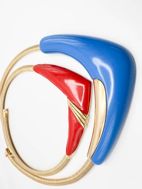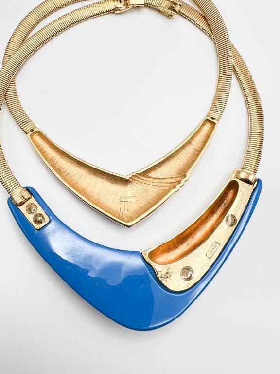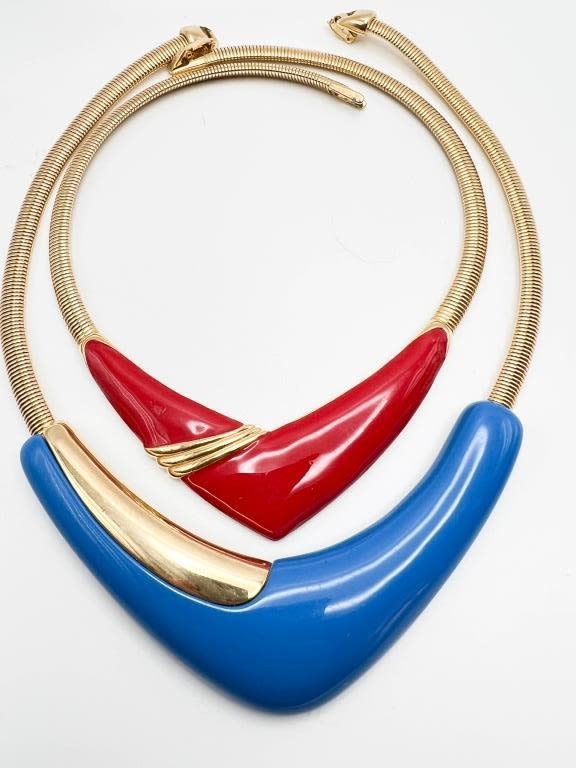 2 MONET SIGNED CHOKER NECKLACES, RED AND BLUE PAINTED ON GOLD TONE
